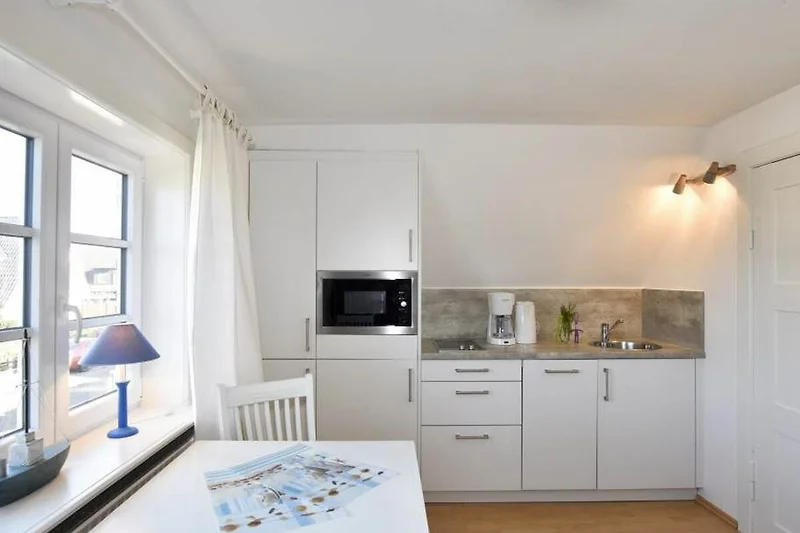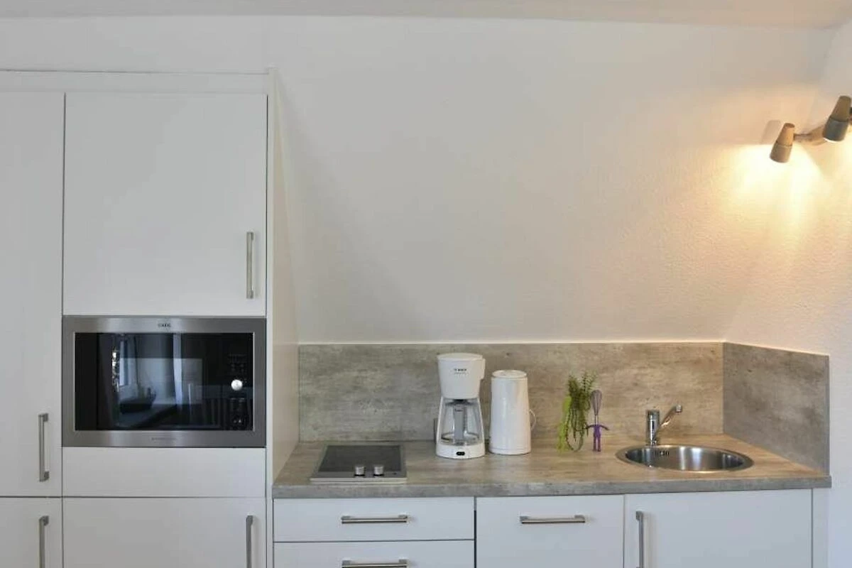 Die Küchenzeile hat einen Ceranfeld mit 2 Kochfeldern, einen Geschirrspüler, eine Mikrowelle mit Grillfunktion und einen Kühlschrank mit 3-Sterne-Gefrierfach. Kaffeemaschine, Wasserkocher und Toaster gehören zur Grundausstattung.