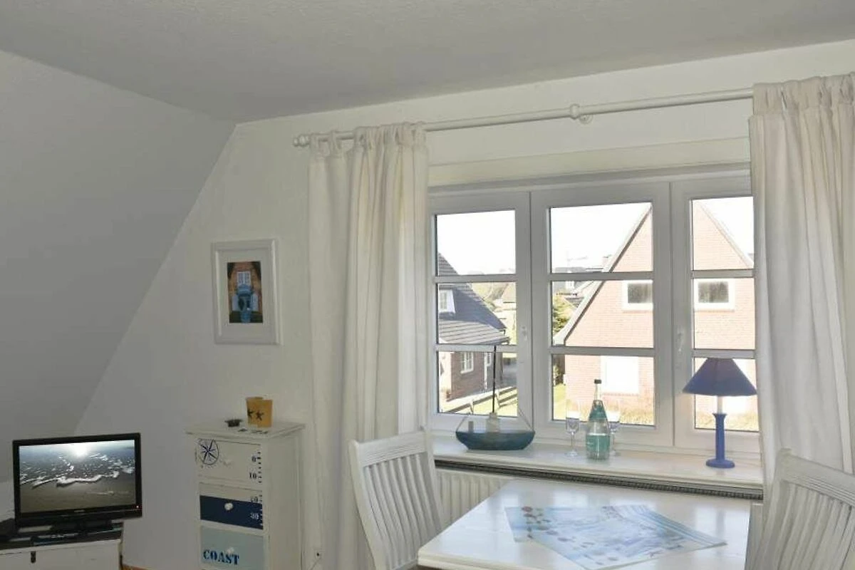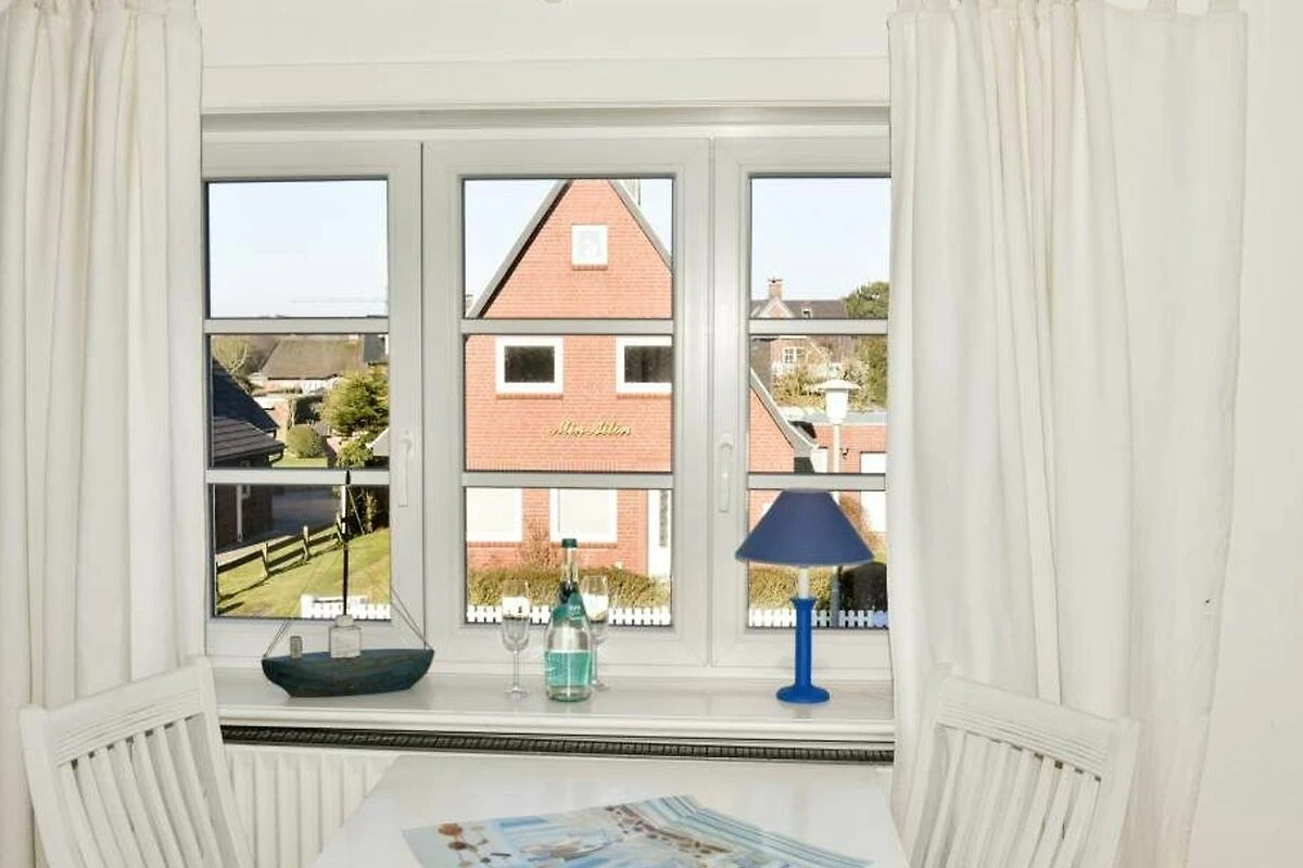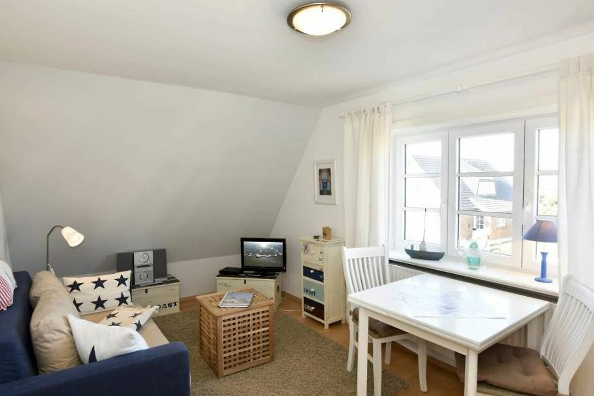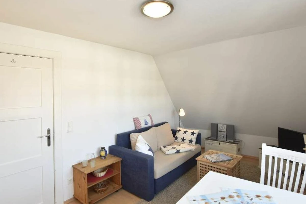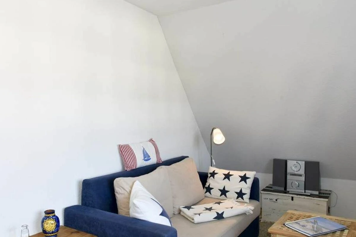 2-Zimmer-Nichtraucher-Ferienwohnung (ca. 45 m²) in der 1. Etage für max. 2 Personen mit eigenem Gartenanteil und Strandkorb (von Ostern bis Oktober) in Ostlage (Morgensonne, mit Terrassenmöbeln und Auflagen).