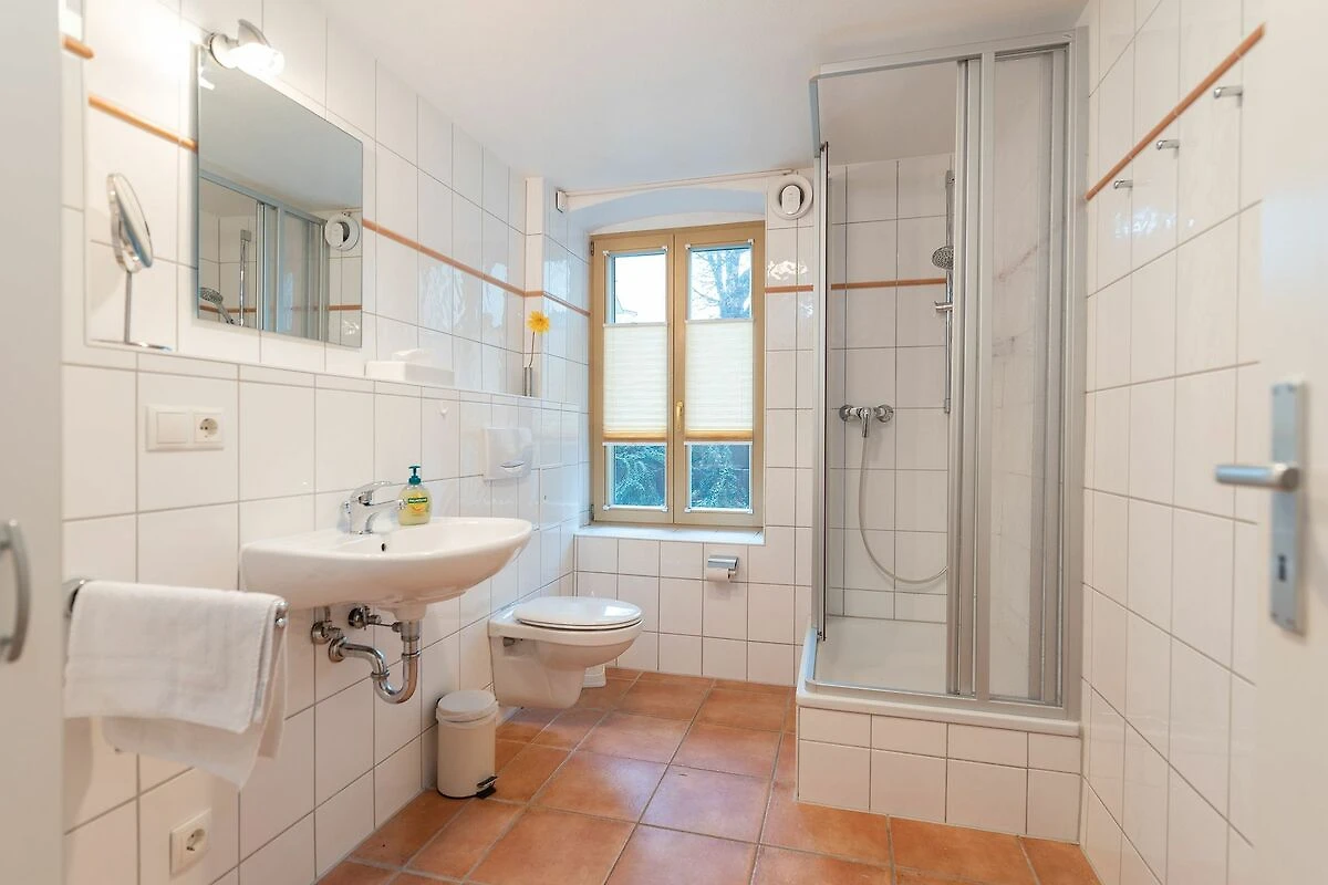 • Tageslicht-Bad mit Eckdusche, Waschbecken und WC