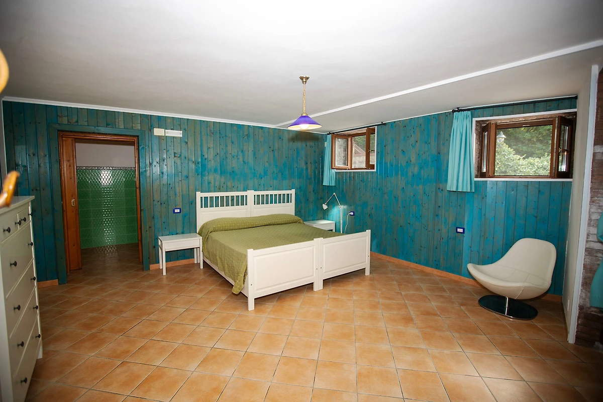 Die 2 Schlafzimmer (Doppelbett; 3 Einzelbetten) haben jeweils ein eigenes Bad. Die Gestaltung der Schlafzimmer in Grün und Blau erinnert auch wieder an die Farben des Meeres und der Olivenbäume.