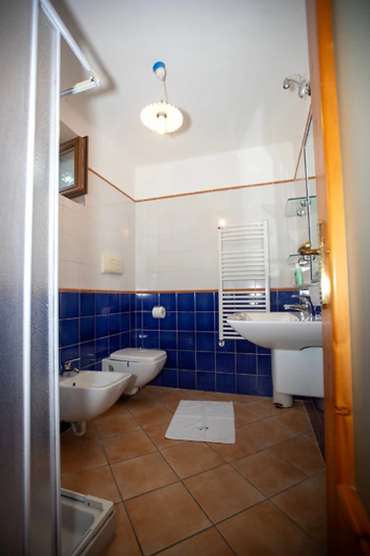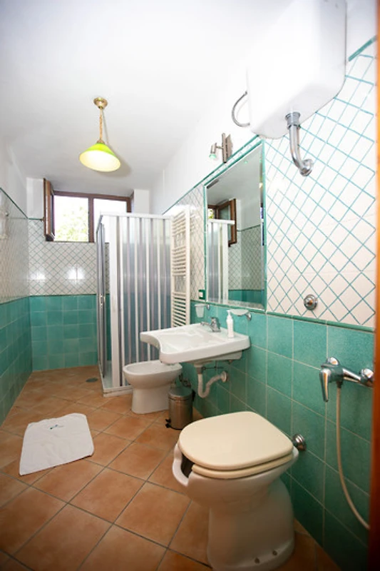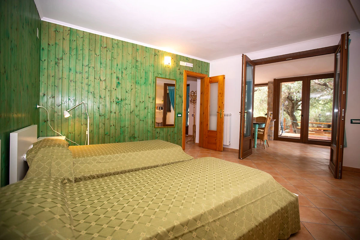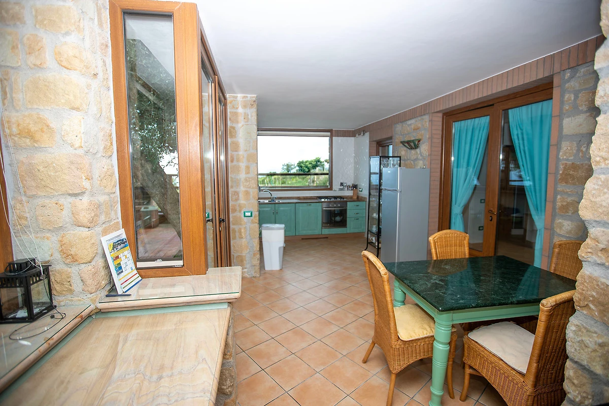 In the large, light flooded kitchen-dining-living room you almost feel like sitting out in the open. From the kitchen area, you have also got a view of the sea, which might add a special flavor to your Mediterranean dishes. The 2 bedrooms (double bed; 3 single beds) have got an en suite bathroom (shower/WC/bidet) each. Designed and held in green and blue, the bedrooms too reflect the colors of the sea and the olive trees.