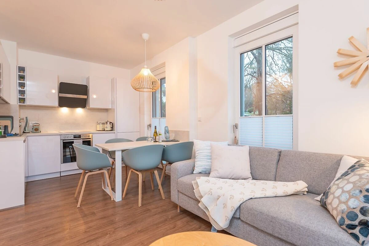 Der Wohnbereich ist lichtdurchflutet und lädt mit einem bequemen Sofa, Flat-TV und einem Elektrokamin zum Entspannen ein. Die voll ausgestattete Küchenzeile mit Essplatz für 4 Personen macht Selbstversorgung zum Vergnügen. Das grosszügige, moderne Badezimmer verfügt über eine grosse Dusche und eine Waschmaschine, die den Komfort während Ihres Aufenthalts erhöht.