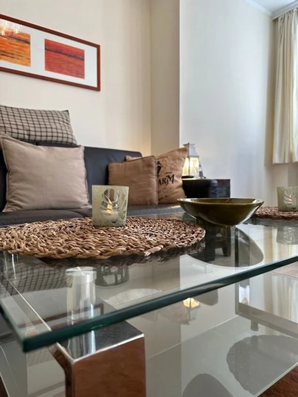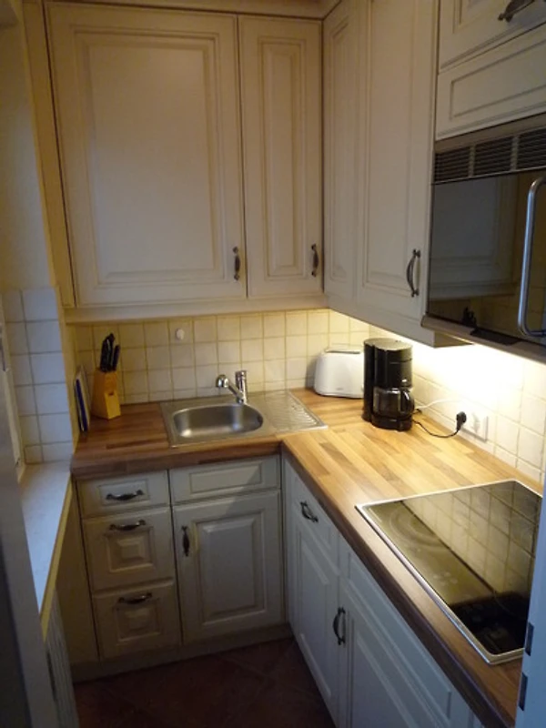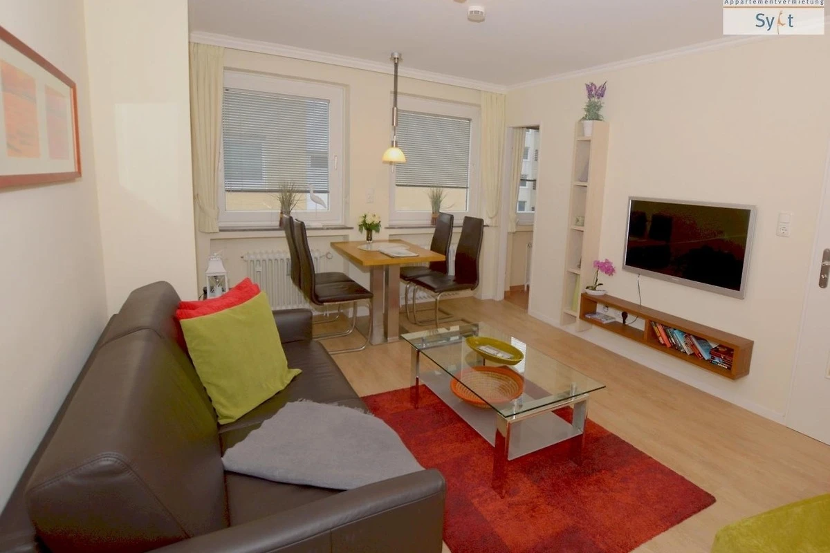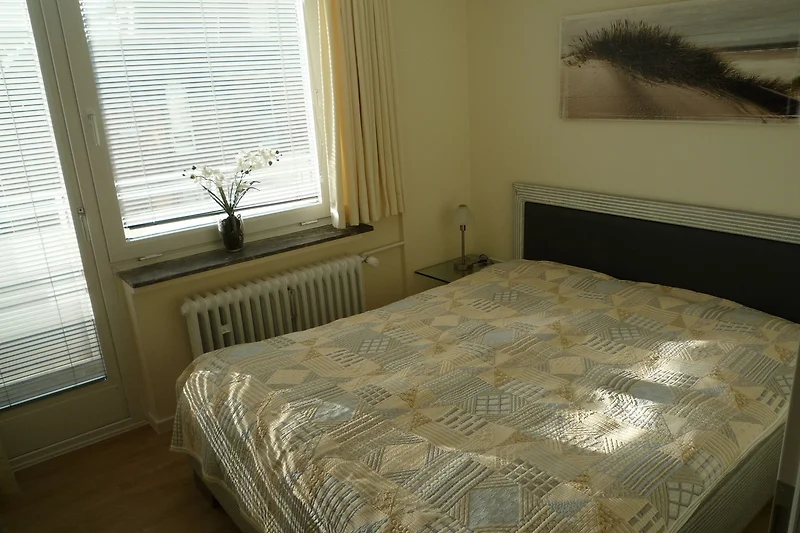 Der hübsche Wohnraum ist mit Vinyl-Designer-Boden ausgelegt, eine Schlafcouch, einen Esstisch mit 4 Stühlen, einen Vitrinenschrank, Flachbild-TV, WLAN (ohne Gewähr) und eine Stereoanlage runden das Bild ab. Im Schlafzimmer befindet sich ein helles Doppelbett und ein heller Kleiderschrank sowie ein weiterer Flachbildfernseher. Ein sonniger Südbalkon schliesst sich mit einem seitlichem Meerblick an. Eine vanillefarbene Einbauküche mit 4-Platten-Ceranfeld, Geschirrspülmaschine und eine Mikrowelle mit Grill stehen Ihnen selbstverständlich zur Verfügung. Der Boden ist mit terracottafarbenen Fliesen ausgelegt. Im weissen Badezimmer befindet sich eine Dusche (die Duschkabine wurde im März 2019 erneuert) und eine Handtuchheizung. Ein Haarföhn steht Ihnen auch zur Verfügung.