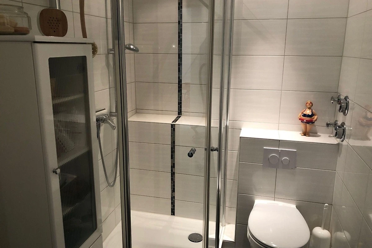 Das Badezimmer verfügt über eine fast bodentiefe Dusche, Handtuchheizkörper und Fön.