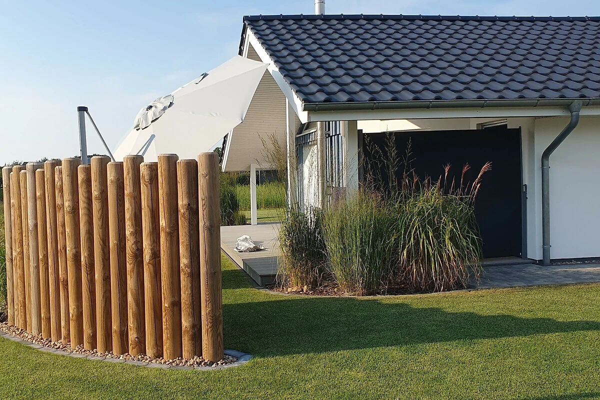 · West-Südwestterrasse mit Gartenmöbeln, Seitenarmmarkise und gr. Ampelschirm.