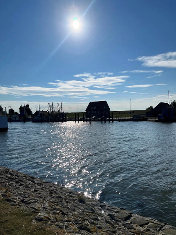 Sobald Ihr das Ferienhaus im Hafendorf in Fedderwardersiel verlasst, spürt und hört ihr bereits die Nordsee in unmittelbarer Nähe. Zu Fuss geht ihr wenige Schritte entlang dem Siel über den neu angelegten Rad- und Fussweg. Bereits ein Haus weiter hat sich das erste Restaurant angesiedelt. Ihr steht innerhalb von wenigen Augenblicken auf dem grünen Deich und könnt zu eurer Rechten bereits Burhave sehen. Dazwischen befindet sich der grosse und gepflegte Zelt- und Campingplatz und der Yachthafen, wo die Boote auf das nächste Hochwasser warten, um auslaufen zu können. Vor euch liegt der Krabbenkutterhafen, das Herzstück Fedderwardersiels. Am Anfang des Hafens befindet sich der berühmte Fischladen von Fedderwardersiel. Dahinter liegen die Fischerkutter, die morgens früh von Ihren Touren zurückkommen.