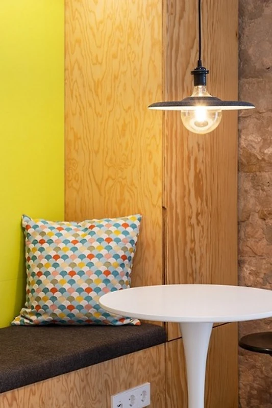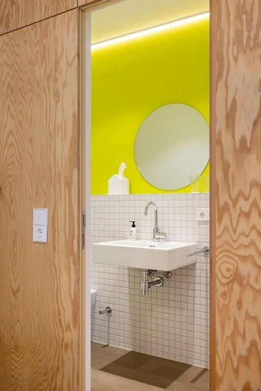 Das alles kombiniert (oder besser: komponiert) mit einer Sandsteinwand, nüchternem Estrich, wohnlicher Seekiefer und einem kräftigen Farbtupfer. Schlicht und schön und: einfach wunderbar.