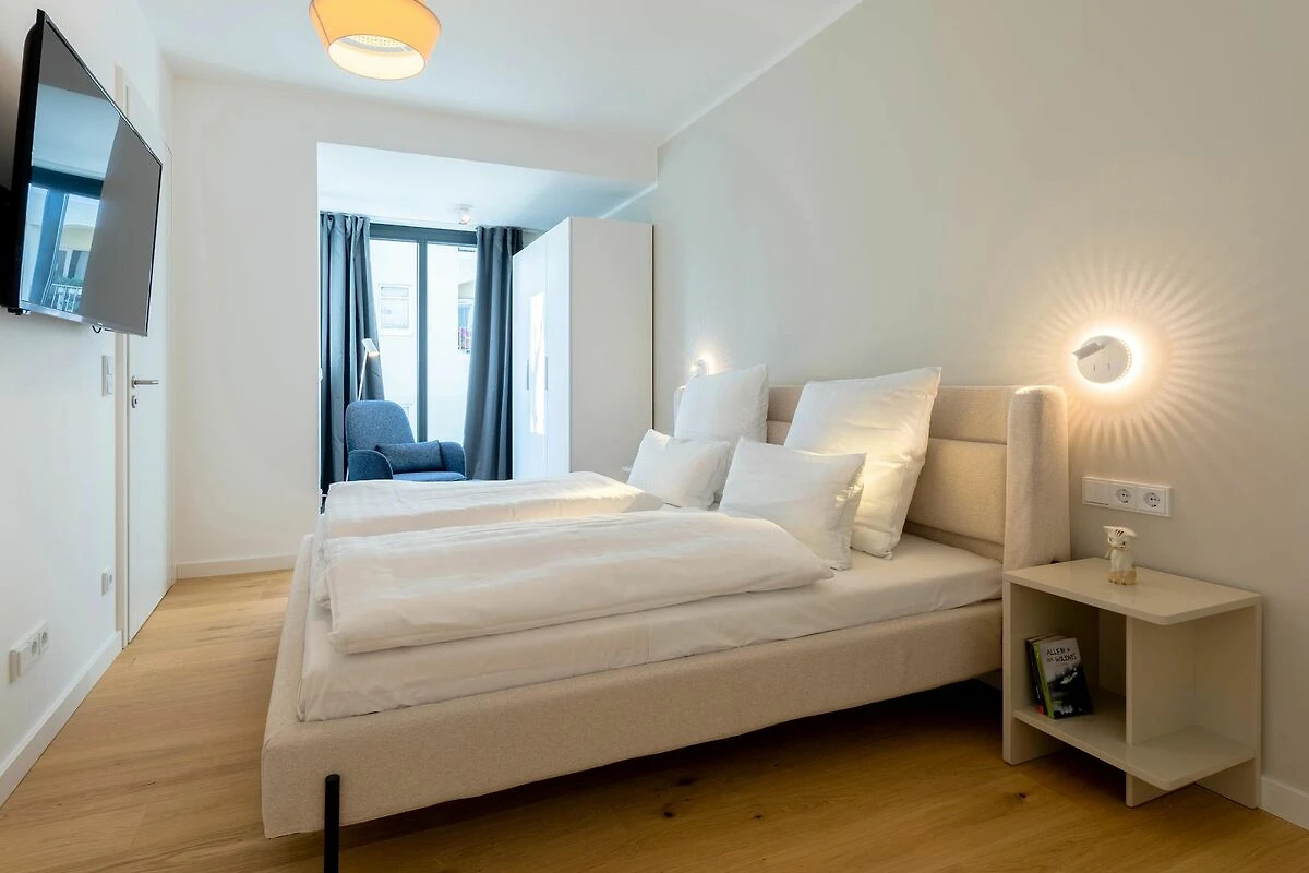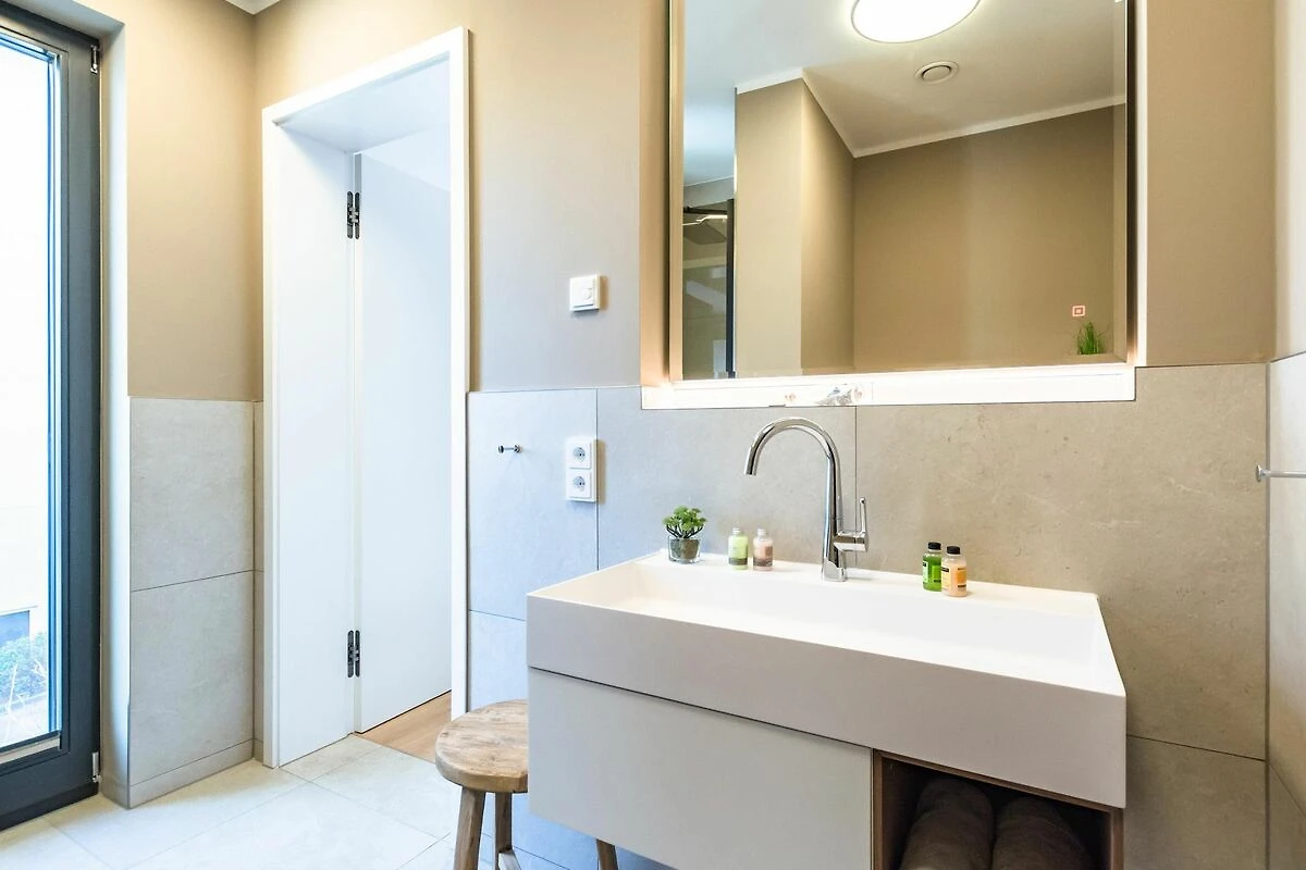 In dieser 2022 erbauten Villa bieten wir Ihnen in der 1. Etage ein App. 60 qm, grosser Südbalkon mit Strandkorb und Balkonmöbeln, kostenfreier Parkplatz mit der Möglichkeit, Fahrräder gesichert unterzustellen. Fahrstuhl und eigene Sauna.