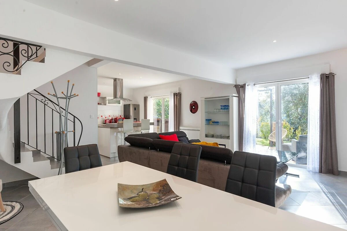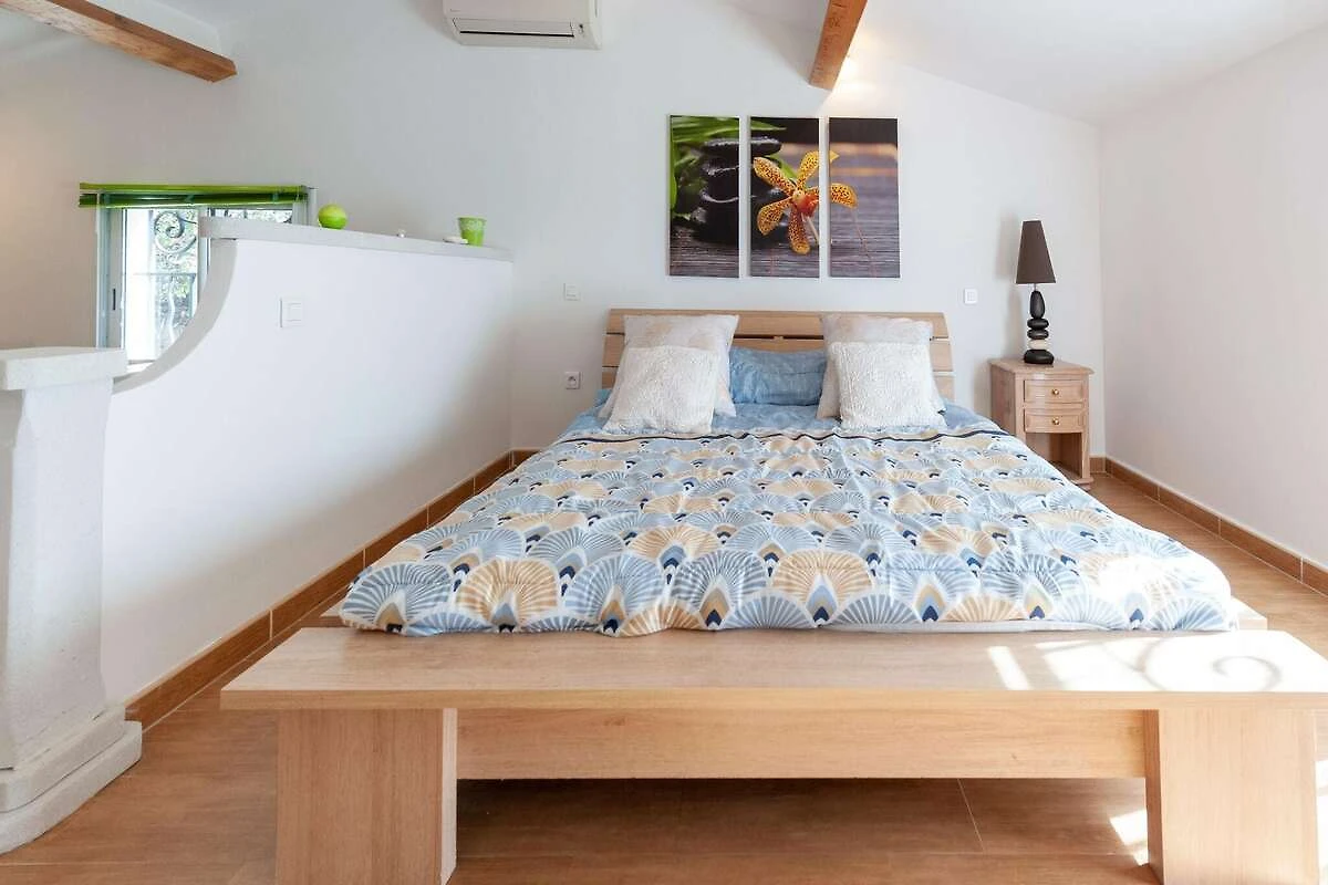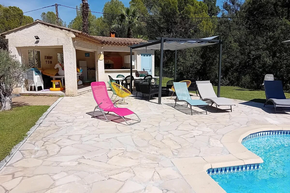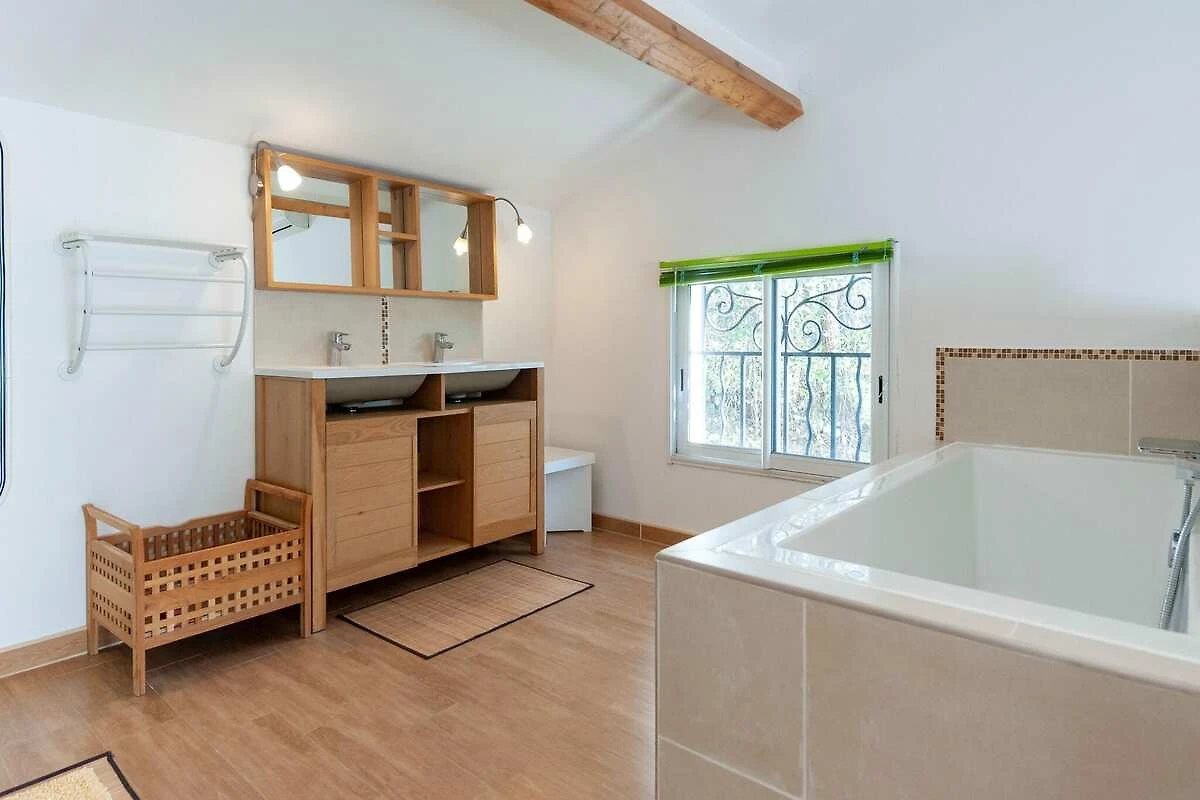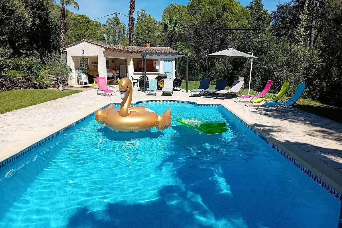 Am Ende einer Sackgasse liegt dieses von Wäldern umgebene Ferienhaus, das im Jahr 2022 komplett renoviert wurde. Es befindet sich auf dem gleichen Grundstück wie das Haus der Eigentümer und bietet seinen Gästen viel Privatsphäre. Ideal für Familien Der umzäunte Swimmingpool mit Kinderbecken (30 cm tief) wird mit den Eigentümern geteilt und befindet sich etwa hundert Meter vom Haus entfernt. Das Anwesen liegt in der Nähe vieler Zentren, das nächste ist La Bouverie in 1,5 km Entfernung. Hier finden Sie schöne Geschäfte und Restaurants, um abends einen angenehmen Abend zu verbringen. Das Zentrum des berühmtesten Fréjus ist 8 km von der Unterkunft entfernt, und ein Tag voller Wasserspaß im nahe gelegenen Wasserpark ist ebenfalls möglich (1,5 km). Das Interieur ist elegant und das gesamte Obergeschoss ist klimatisiert; für eine angenehme Temperatur an heißen Sommertagen.Das Hauptschlafzimmer verfügt über ein eigenes Duschbad und die anderen Schlafzimmer teilen sich ein Badezimmer. Es gibt ein großes Schlafsofa, das bequem Platz für 2 Kinder bietet. Der Flughafen Nizza ist 65 km entfernt.