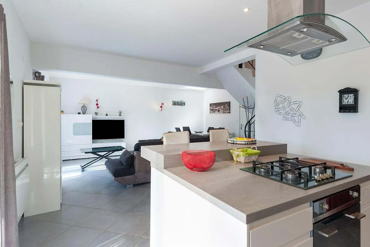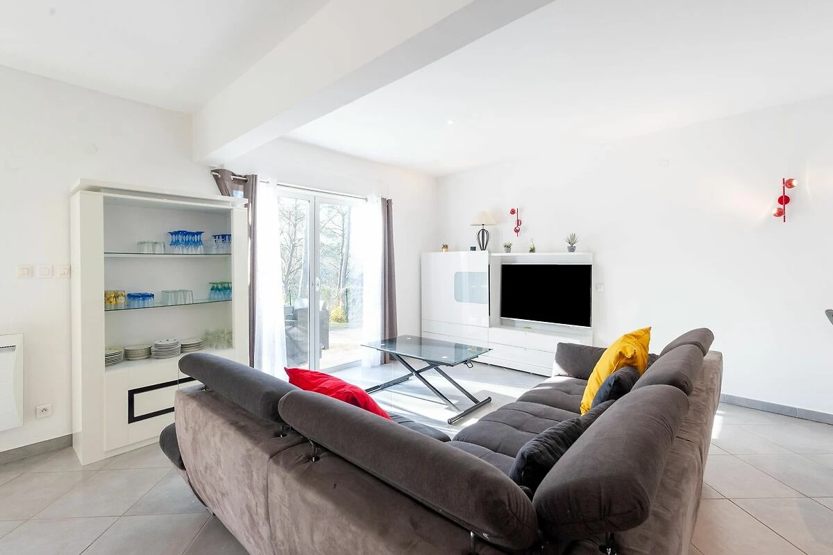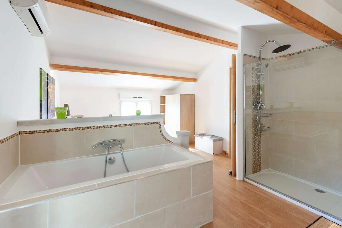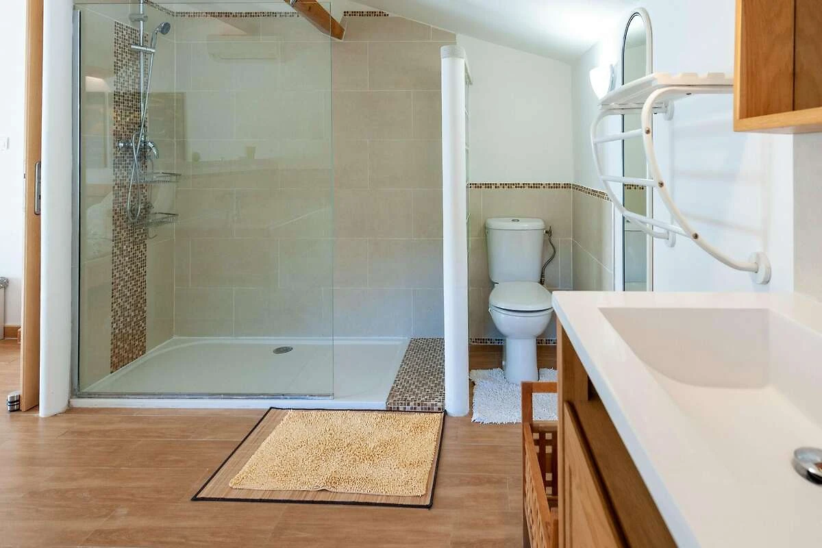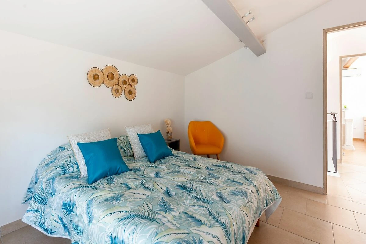 Am Ende einer Sackgasse liegt dieses von Wäldern umgebene Ferienhaus, das im Jahr 2022 komplett renoviert wurde. Es befindet sich auf dem gleichen Grundstück wie das Haus der Eigentümer und bietet seinen Gästen viel Privatsphäre. Ideal für Familien Der umzäunte Swimmingpool mit Kinderbecken (30 cm tief) wird mit den Eigentümern geteilt und befindet sich etwa hundert Meter vom Haus entfernt. Das Anwesen liegt in der Nähe vieler Zentren, das nächste ist La Bouverie in 1,5 km Entfernung. Hier finden Sie schöne Geschäfte und Restaurants, um abends einen angenehmen Abend zu verbringen. Das Zentrum des berühmtesten Fréjus ist 8 km von der Unterkunft entfernt, und ein Tag voller Wasserspaß im nahe gelegenen Wasserpark ist ebenfalls möglich (1,5 km). Das Interieur ist elegant und das gesamte Obergeschoss ist klimatisiert; für eine angenehme Temperatur an heißen Sommertagen.Das Hauptschlafzimmer verfügt über ein eigenes Duschbad und die anderen Schlafzimmer teilen sich ein Badezimmer. Es gibt ein großes Schlafsofa, das bequem Platz für 2 Kinder bietet. Der Flughafen Nizza ist 65 km entfernt.