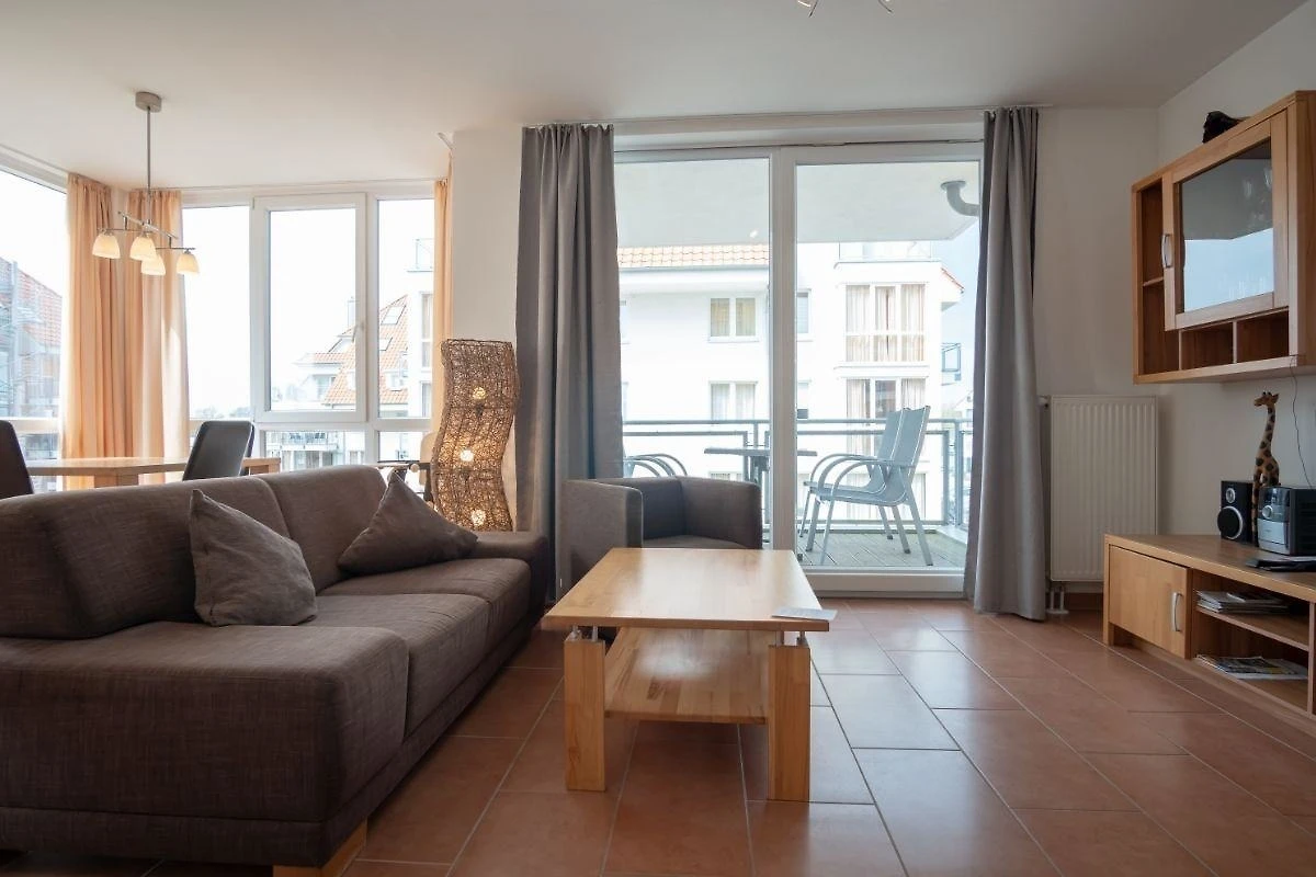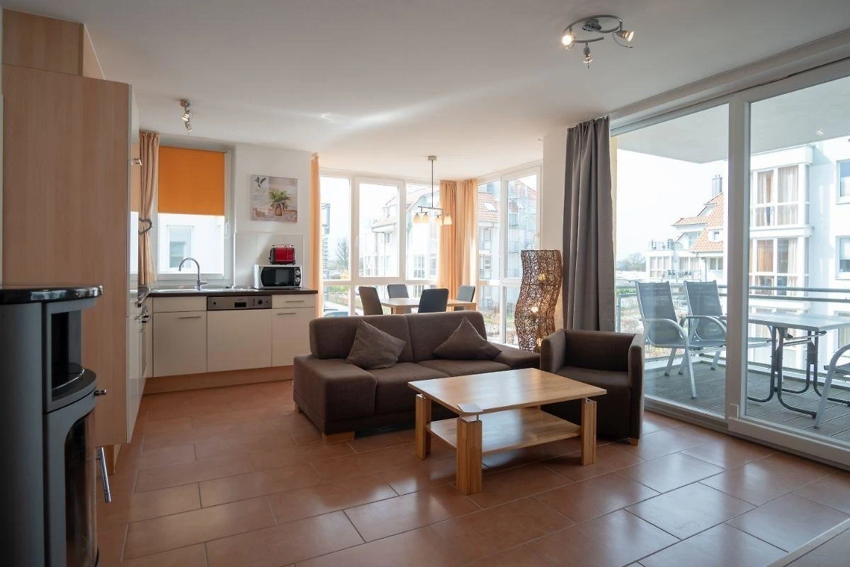 Die Wohnung verfügt über einen lichtdurchfluteten Wohnbereich mit einer gemütlichen Sitzecke mit Kaminofen, einer Essecke mit Blick ins Grüne und der angrenzenden offenen Küchenzeile. Vom Wohnbereich aus gelangt man auf den Balkon - man kann die Ostsee schon riechen. Im Schlafzimmer erwartet Sie ein gemütliches Doppelbett, im zweiten Schlafzimmer (Kinderzimmer) steht ein Kojenbett zur Verfügung. Für Wellnessfans ist das Badezimmer bestens geeigent: Sauna und Whirlpool gehören neben einer einfachen Dusche ebenfalls zur Ausstattung.