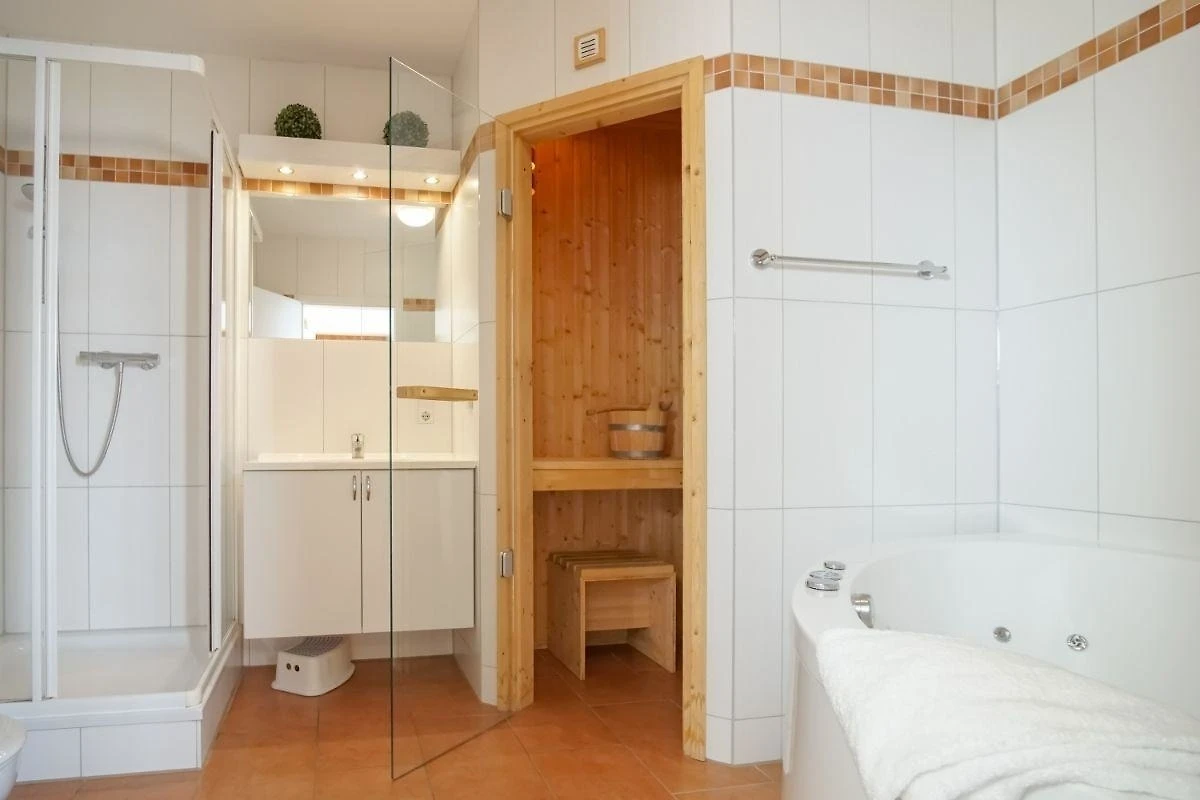 Die Wohnung verfügt über einen grosszügigen Wohn- und Essbereich und eine grosse Küche die keine Wünsche offenlässt. Seperat gibt es zwei Schlafzimmer, eins mit Doppelbett und eins mit Kojenbett. Das Vollbad verfügt über eine kleine Sauna und eine Badewanne mit Whirlpoolfunktion.