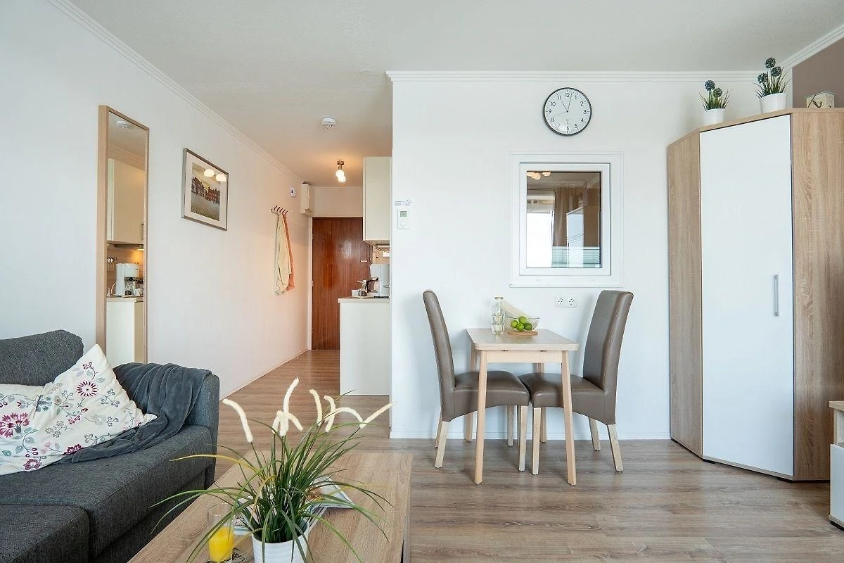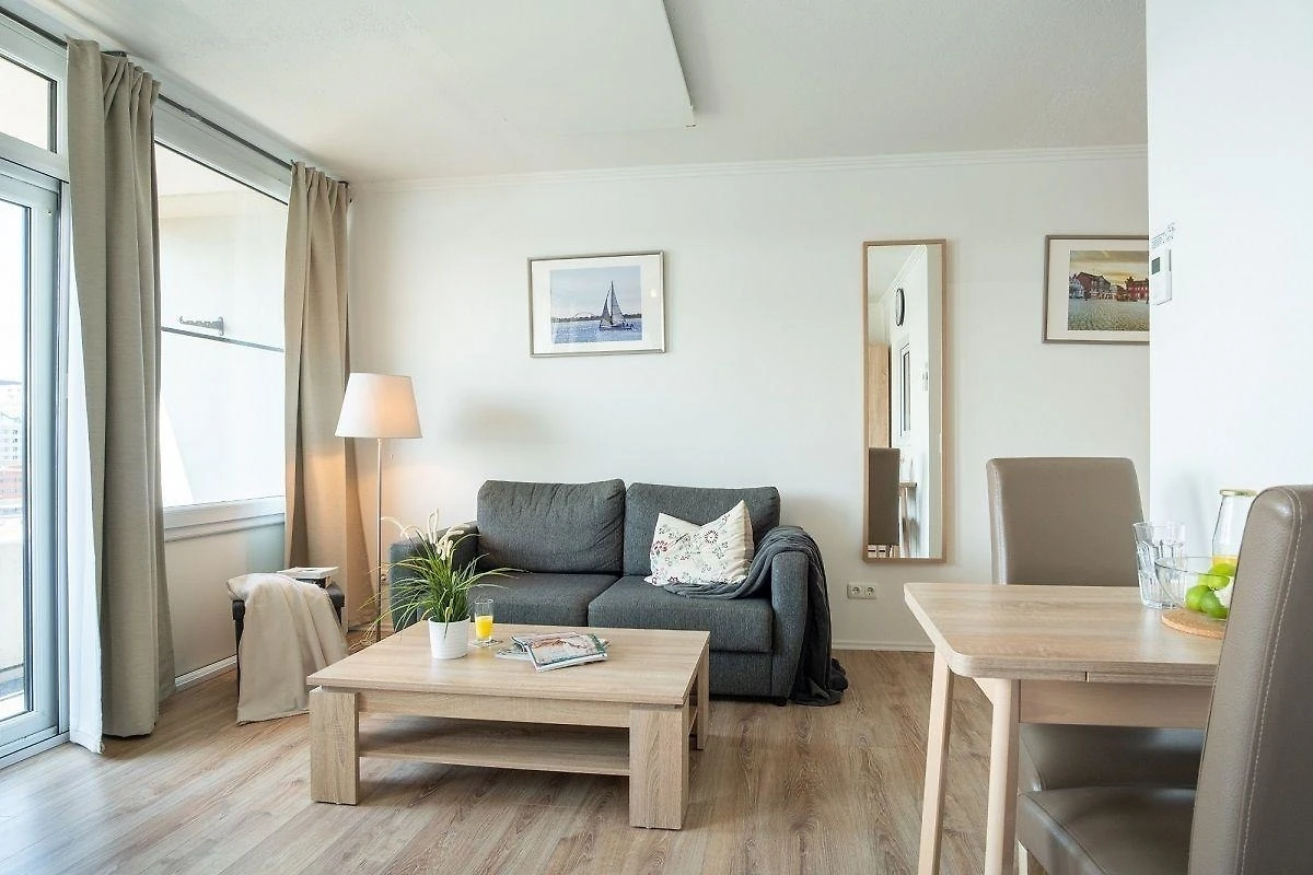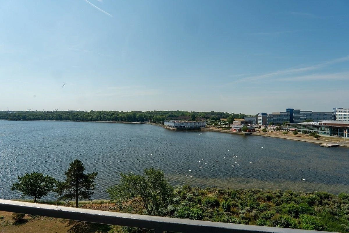 Die stylische 1,5-Zimmer-Wohnung befindet sich in der 6. Etage und verfügt auf 36m² über einen gemütlichen Wohn-Essbereich, eine kleine Küchenzeile, ein getrenntes Schlafzimmer und ein Duschbad. Vom Wohnbereich aus gelangen Sie auf den Südbalkon mit tollem Ausblick zum Binnensee und seitlich zur Ostsee!