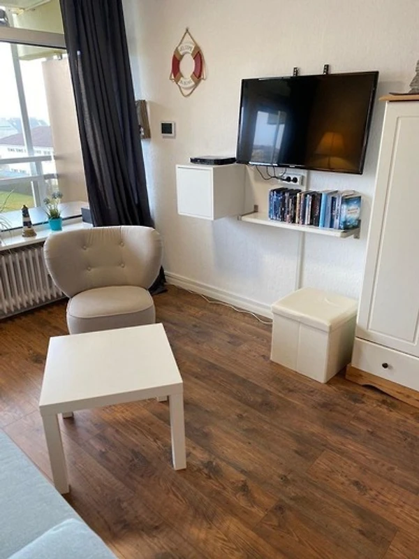 Der lichtdurchflutete Wohnbereich ist mit einer gemütlichen Sofaecke (Schlafsofa), einem Flatscreen-TV und Bluray-Player ausgestattet. Die vorhandene Musikanlage verfügt über Blutooth. Vom Wohnzimmer aus gelangen Sie auf den Süd-Balkon mit tollem Ausblick.