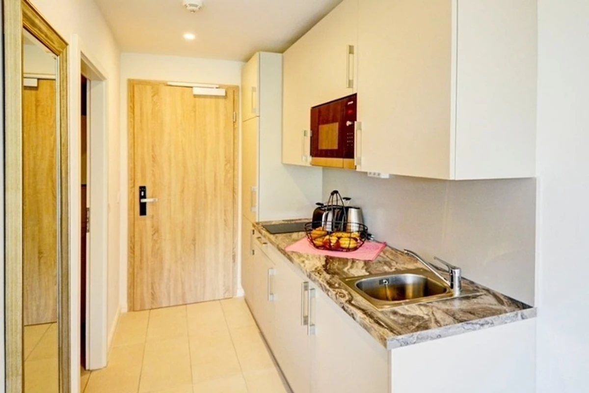 Die komplett zur Sonnenseite ausgerichtete Wohnung im 7. Stock, erreichbar mit dem Fahrstuhl, bietet den ganzen Tag über Sonnenschein. Im Wohn-Schlafbereich erwartet Sie ein hochwertiges Doppelbett, ein geräumiger Kleiderschrank, ein TV und eine sonnige Essecke.
