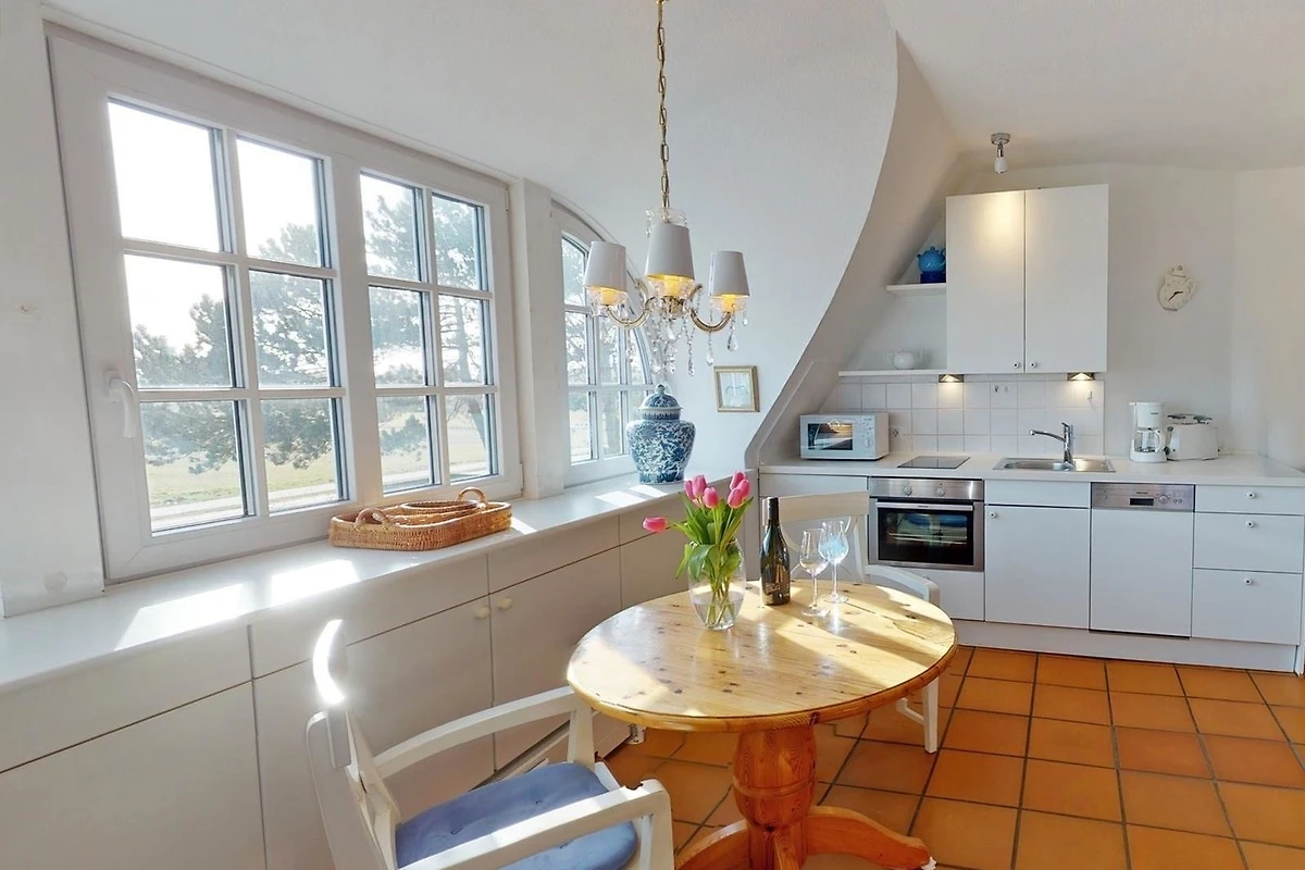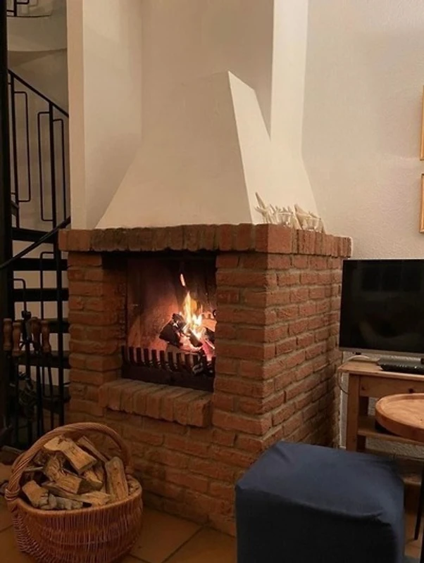 Die offene Küchenzeile ist perfekt zum Zubereiten von Mahlzeiten und bietet alle notwendigen Geräte, einschliesslich eines Geschirrspülers, Elektro- und Gasherd, Backofen, Kühlschrank, Kaffeemaschine und Toaster. Ein gemütlicher Kamin oder Kachelofen sorgt für eine angenehme Atmosphäre an kühleren Abenden.