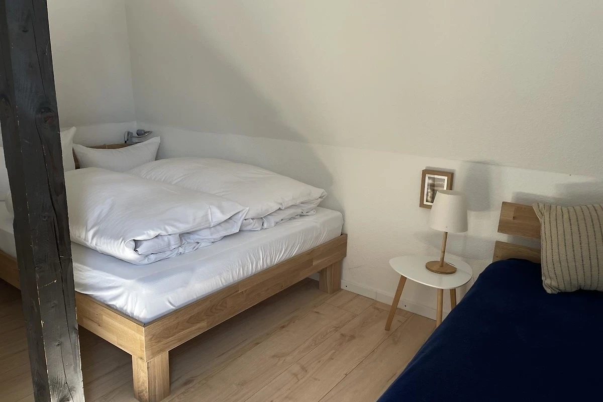 Die Ferienwohnung bietet eine komfortable und gut ausgestattete Unterkunft für erholsame Tage. Sie verfügt über ein Schlafzimmer mit einem Doppelbett und einem Einzelbett, ideal für Familien oder Paare. Das Duschbad ist modern und funktional.