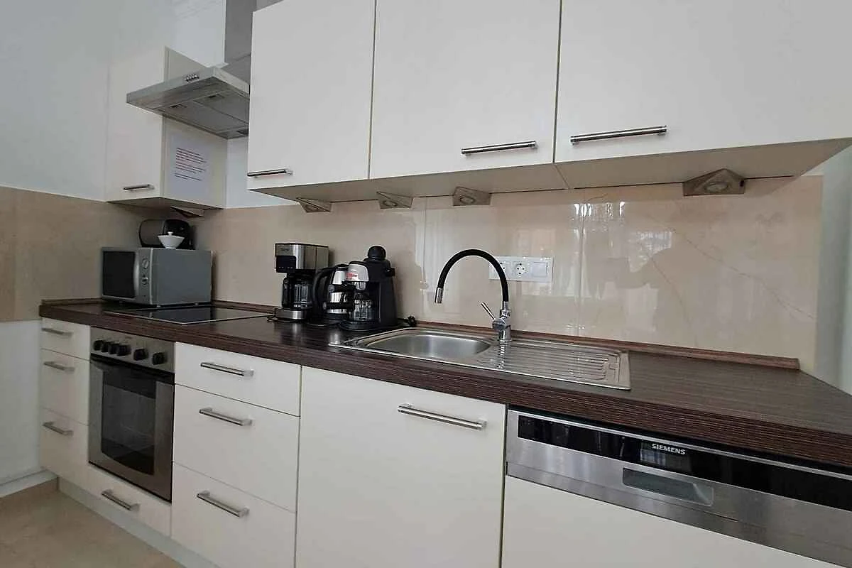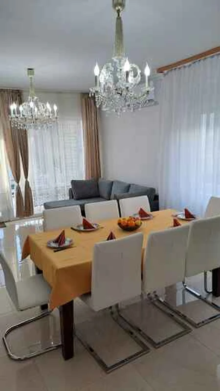 Der Eingang in Ihre Ferienwohnung befindet sich im Erdgeschoss und führt direkt in das Wohnzimmer. Wohnzimmer (Durchgangszimmer) mit Sitzecke, TV und Zugang zur Terrasse (Gartenmöbel, 1 Tisch, 8 Stühle). 2 Schlafzimmer jeweils mit 1 Doppelbett und 1 Zusatzbett auf Schlafgelegenheit. Schlafzimmer mit 1 Doppelbett. Amerikanische Küche mit Essecke (8 Plätze), Elektroherd (Cerankochfeld, 4 Platten), Backofen, Geschirrspüler, Kühlschrank (200 l, Eisfach), Mikrowelle, Kaffeemaschine, Toaster, elektrischem Wasserkocher und Zugang zur Terrasse. Bad mit Dusche, 1 Waschbecken, WC und Fenster. Bad mit Dusche, 1 Waschbecken, WC, Föhn und Fenster.