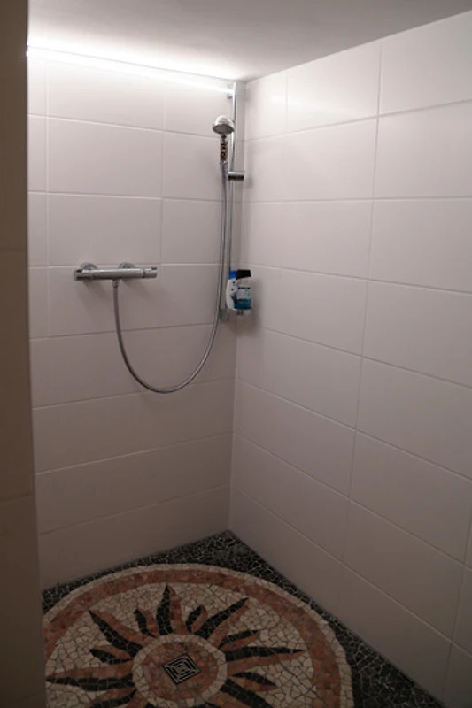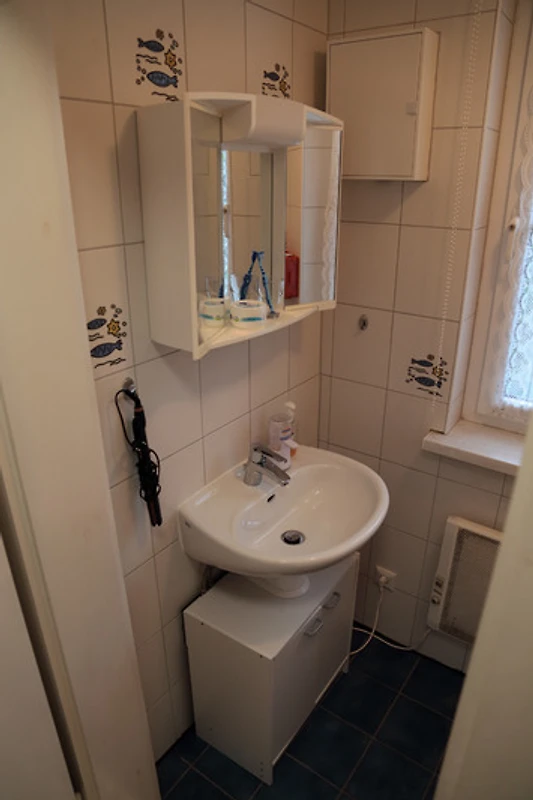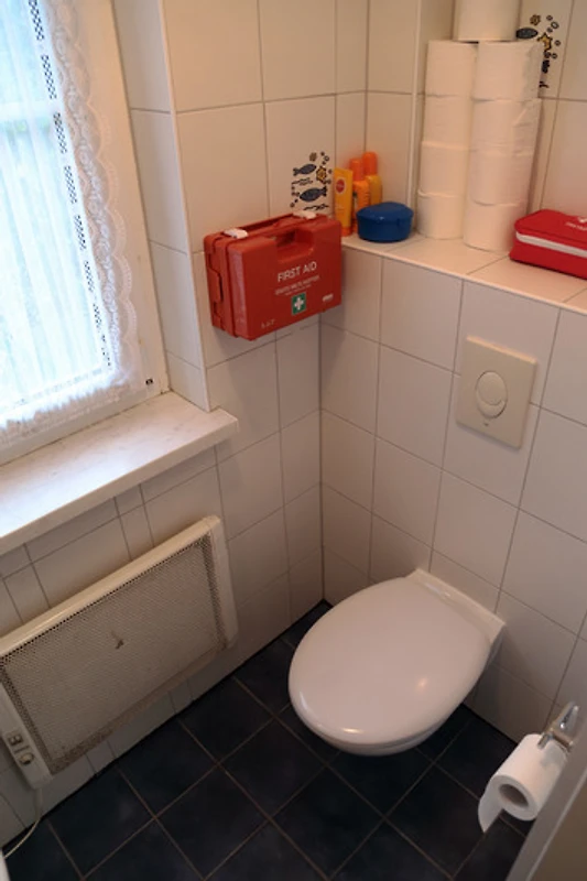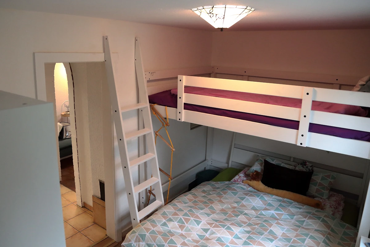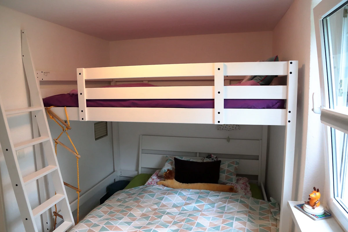 Badezimmer mit Dusche Waschmaschine und Trockner. Separates WC. Schlafzimmer mit einem Ehe- plus Kinderbett für zwei Kinder und einem Kleiderschrank.