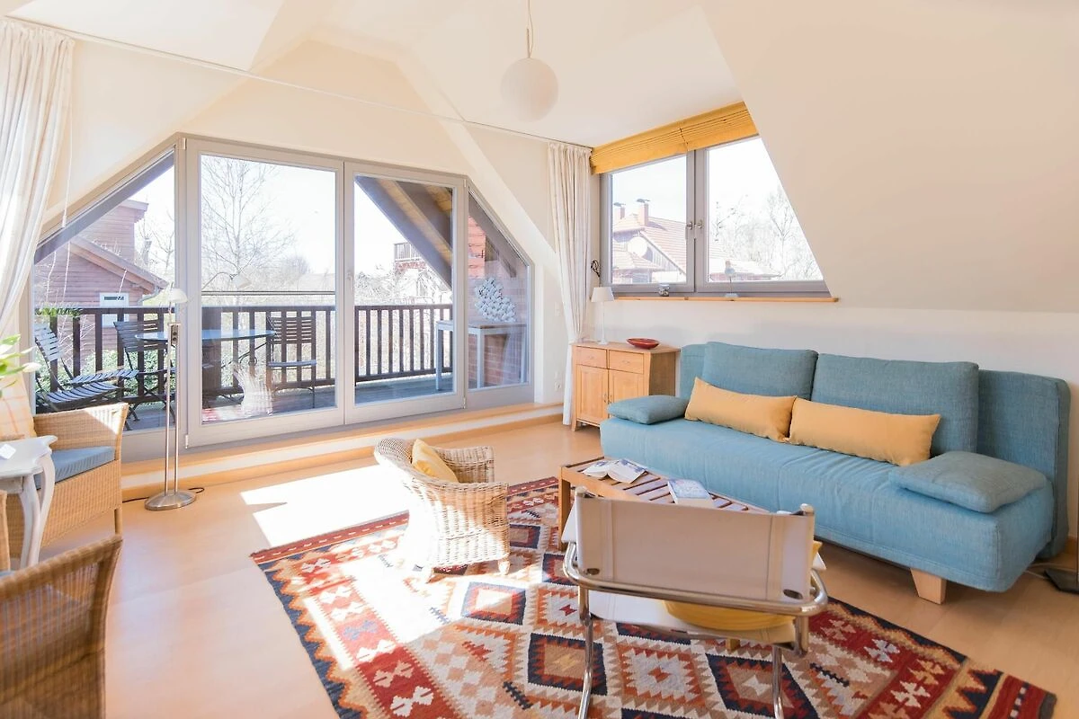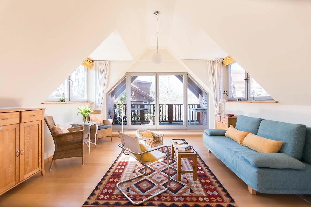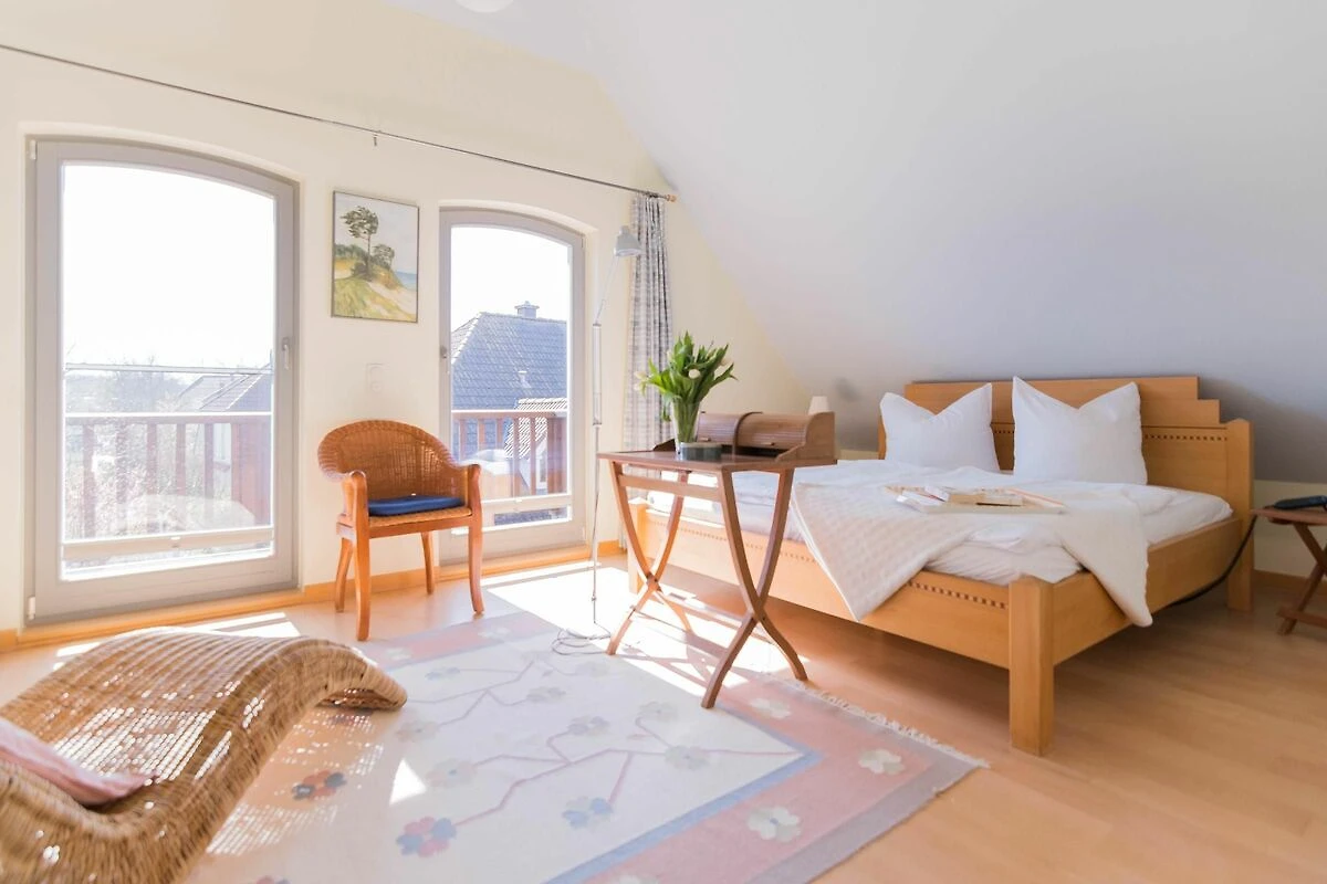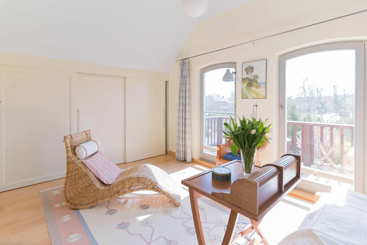 Die zwei Schlafzimmer liegen im Dachgeschoss des Hauses und somit in der oberen Etage der Maisonette-Wohnung. Sie setzen sich aus zwei Doppelbettzimmern zusammen, von denen eines auf den oberen Südwest-Balkon führt. Neben diesen vier Schlafplätzen können vier weitere Personen auf den Ausziehsofas im Wohn- und Lesezimmer nächtigen.