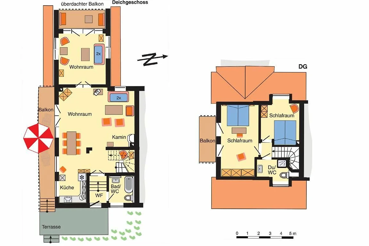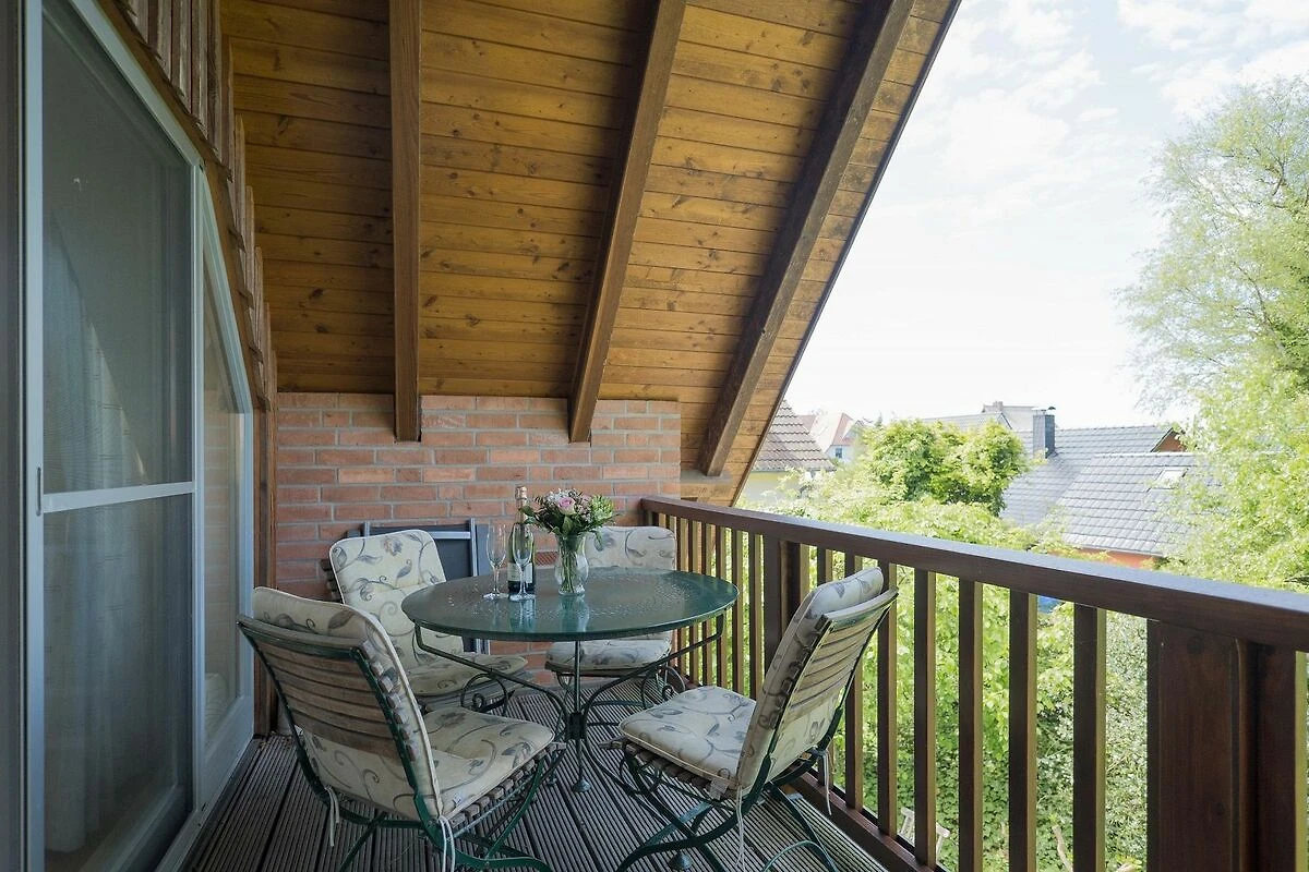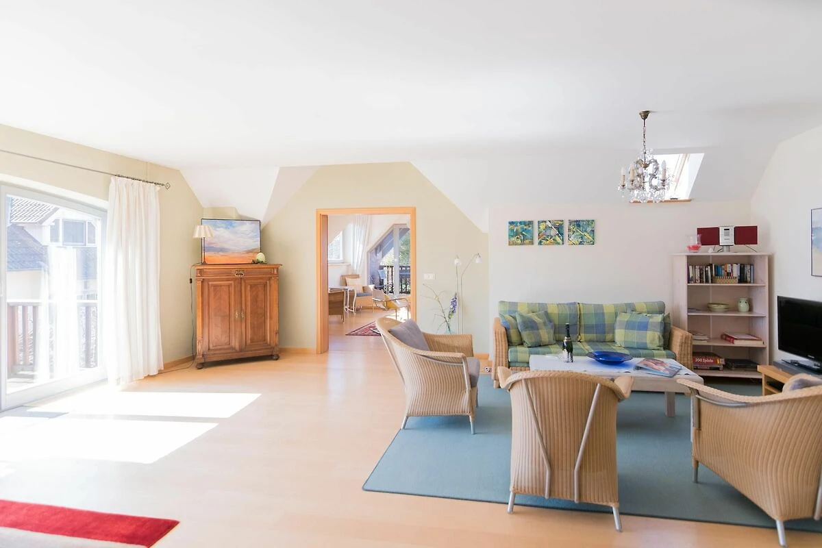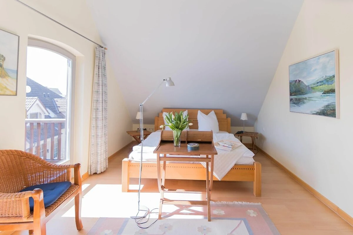 Die zwei Schlafzimmer liegen im Dachgeschoss des Hauses und somit in der oberen Etage der Maisonette-Wohnung. Sie setzen sich aus zwei Doppelbettzimmern zusammen, von denen eines auf den oberen Südwest-Balkon führt. Neben diesen vier Schlafplätzen können vier weitere Personen auf den Ausziehsofas im Wohn- und Lesezimmer nächtigen.