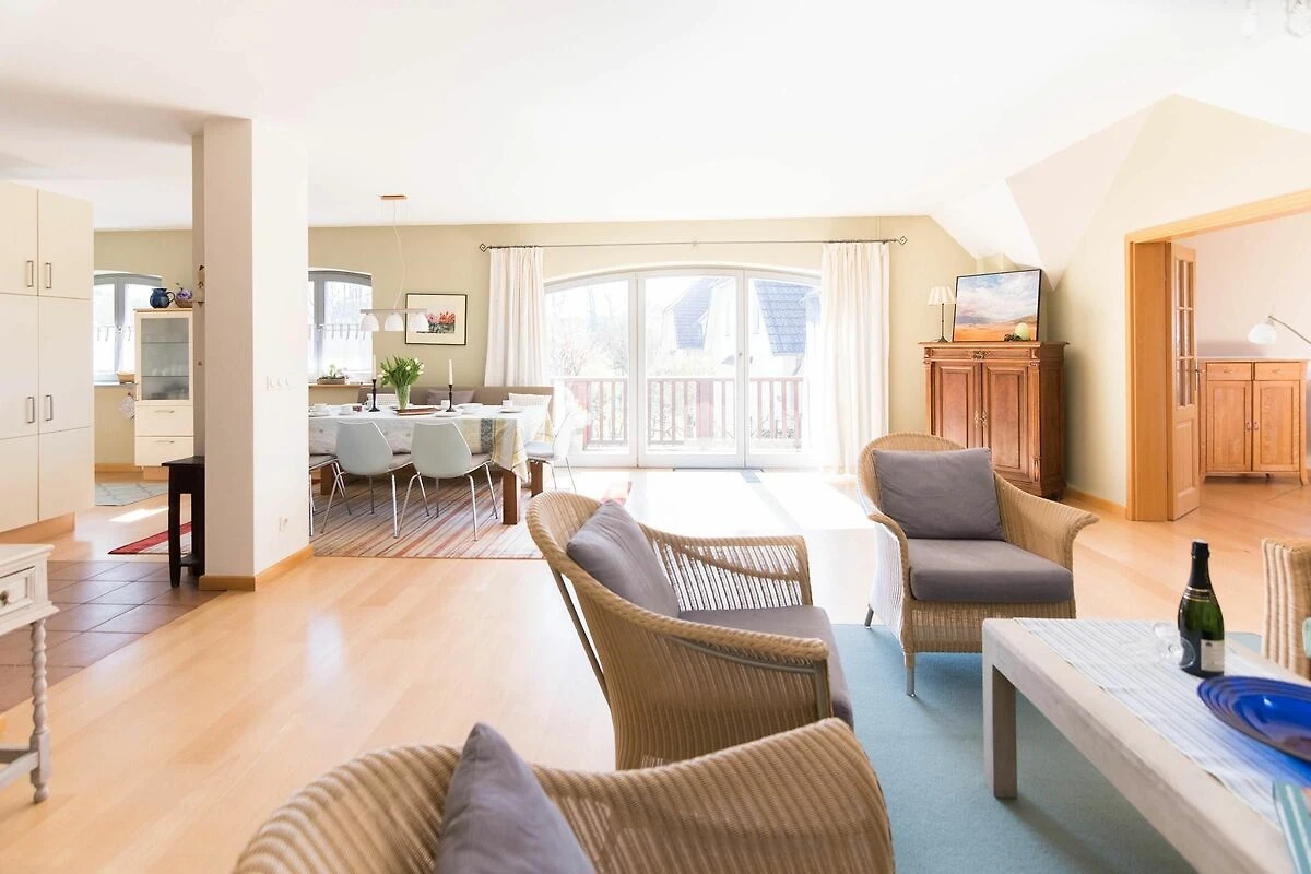 Nur rund 50 Meter vom Badestrand entfernt befindet sich diese schöne Maisonette-Wohnung als Teil des Dünenhofes. Unter den Wohnungen des Ferienwohnparks überzeugt dieses Objekt mit seiner großen Wohnfläche von 117m², zwei Balkonen sowie einer Loggia. Damit ist diese Ferienwohnung die größte dieser Siedlung.