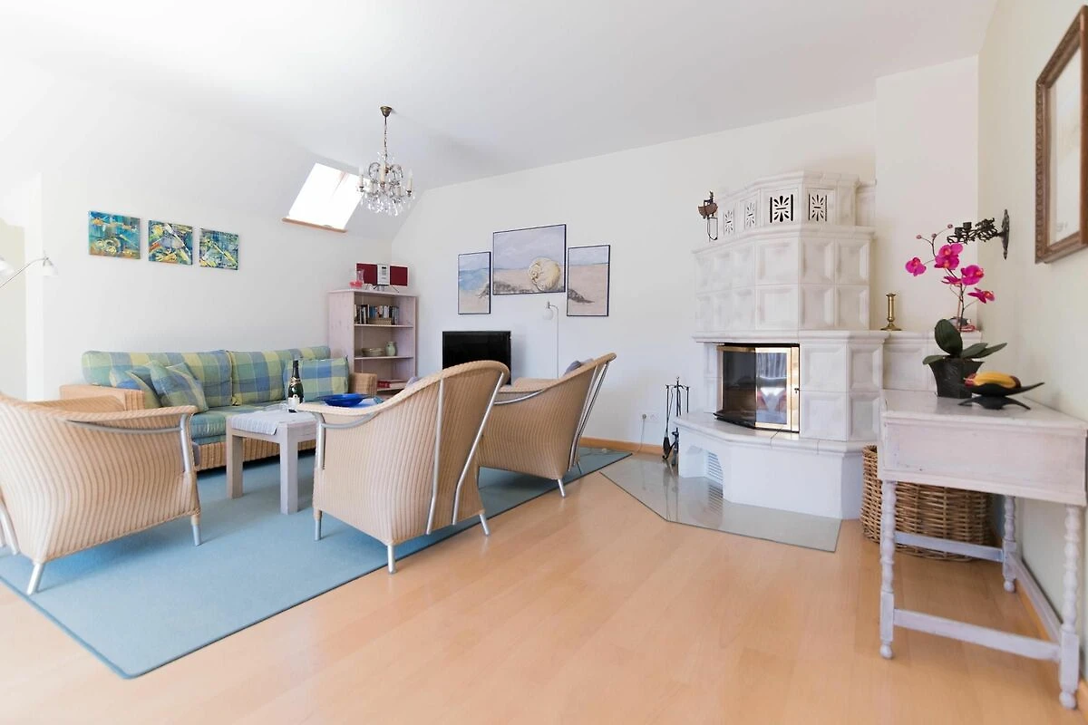 Der Wohnraum vereint die mit einer Waschmaschine, einer Geschirrspülmaschine, einem Backofen und einem Kochfeld voll ausgestatteten offenen Küche mit dem Essplatz und der Fernsehecke. Das gemütliche Ambiente dieses großen Raumes wird dabei von dem urigen Kamin unterstrichen. Von hier aus geht es hinaus auf den größten der drei Balkone, der – wie die anderen auch – möbliert ist.