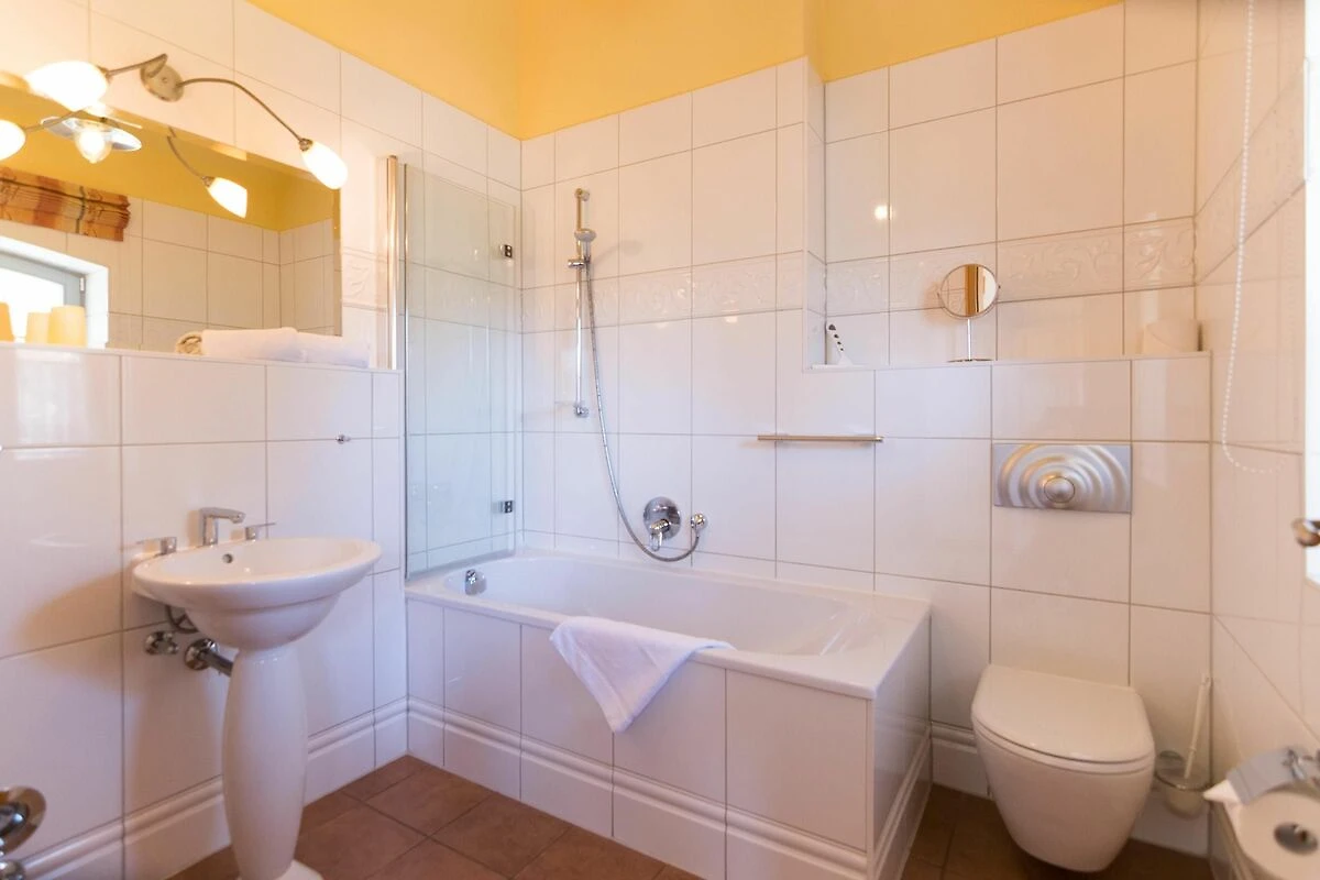 Neben dem Duschbadezimmer im Dachgeschoss verfügt die Ferienwohnung zudem über ein Badezimmer mit Badewanne in der unteren Etage der Maisonette-Wohnung, also im ersten Obergeschoss des Hauses.