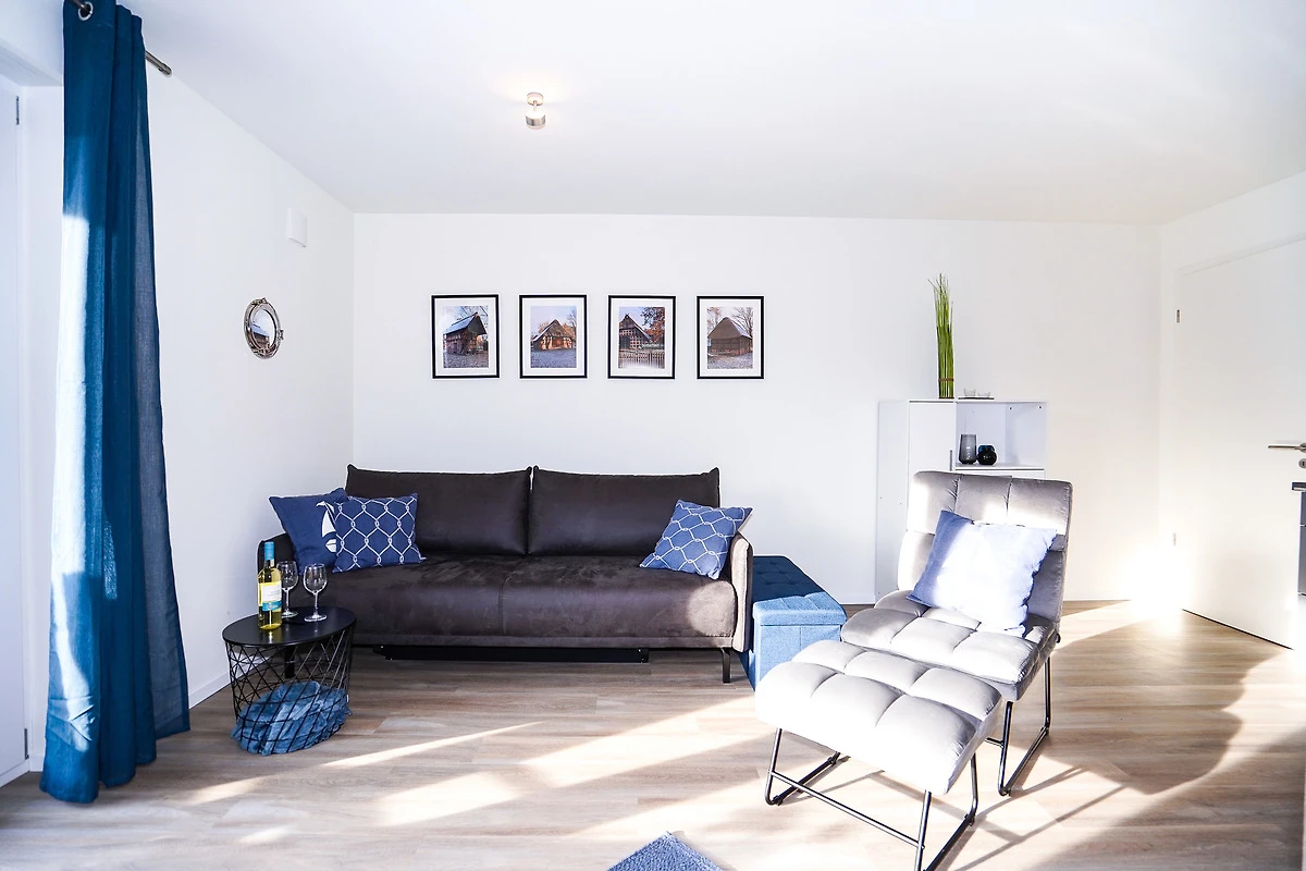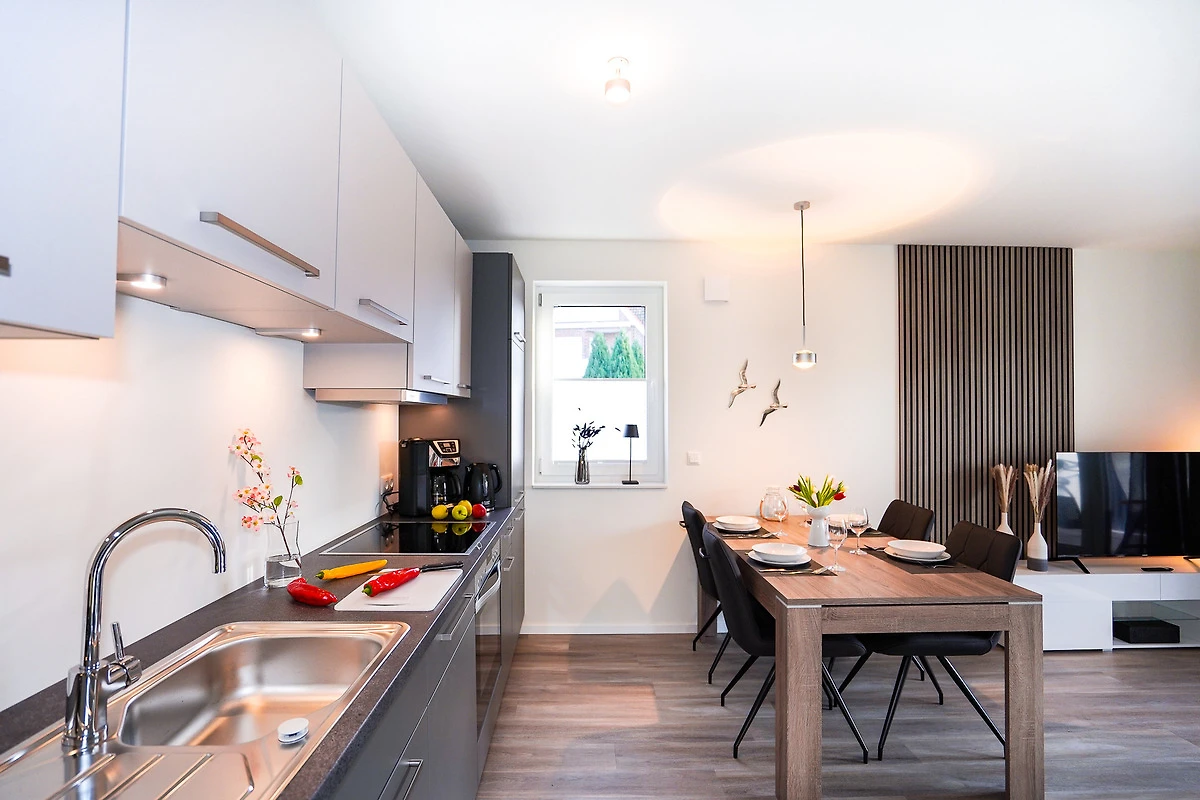 Die im 1. OG liegende Ferienwohnung überzeugt durch ihre bodentiefen Fenster, welche viel Licht hereinlassen. Das Wohnzimmer ist mit einer hochwertigen und bequemen Schlafcouch (150x200cm), einem Fernsehsessel und einer Essgruppe ausgestattet. Ein grosser Flatscreen-TV und WLAN (Glasfaser) stehen Ihnen zum Ausklingen des Tages zur Verfügung. Die stilvolle und offene Küche ist mit allen erforderlichen Geräten wie bsp. Backofen, Induktionsherd, Spülmaschine und Kühlschrank mit Gefrierfach ausgestattet.