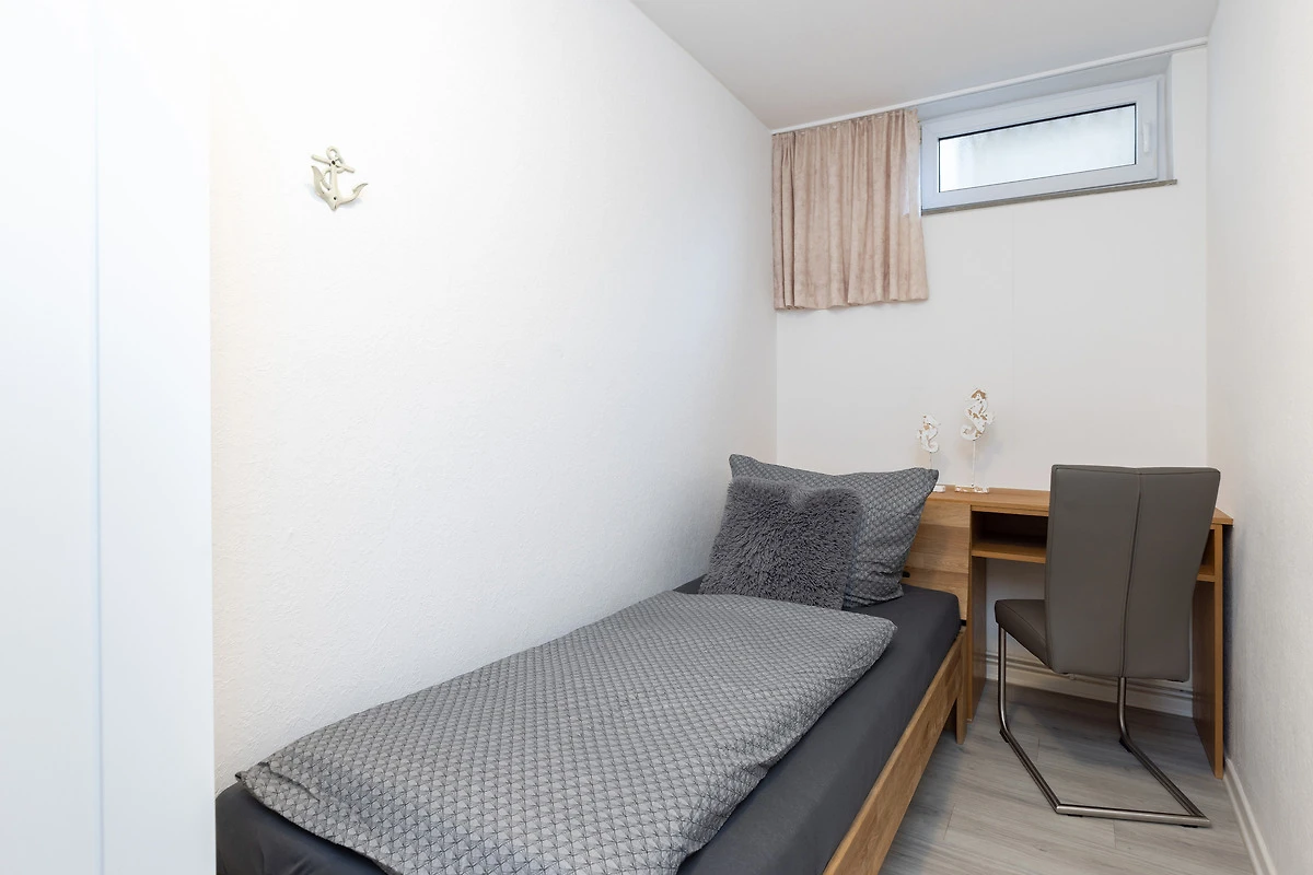 Die Unterkunft bietet 1 Schlafzimmer mit Doppelbett (180x200 cm) und einen Schlafraum mit Einzelbett (90x200 cm). Ausserdem kannst du dich im Wohnzimmer mit Essbereich und angeschlossener Winkelküche wohlfühlen. Die grossen Fenster lassen viel Tageslicht hinein.