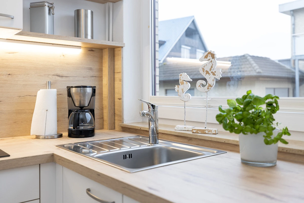 Die Küche ist neben einem Kühlschrank mit Eisfach auch mit einer Mikrowelle, einer Filterkaffeemaschine und einem Wasserkocher ausgestattet.