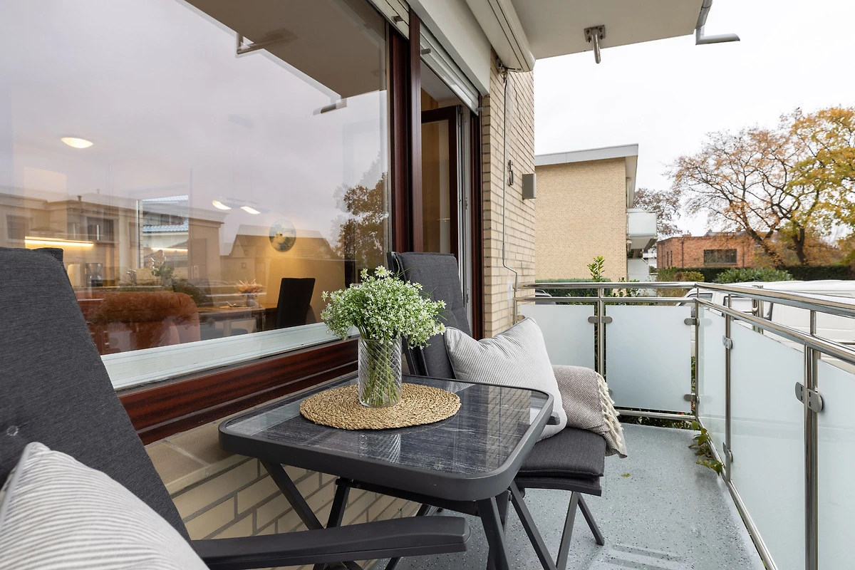 Im Aussenbereich (Balkon) laden Gartenstühle zur entspannten Pause ein.
