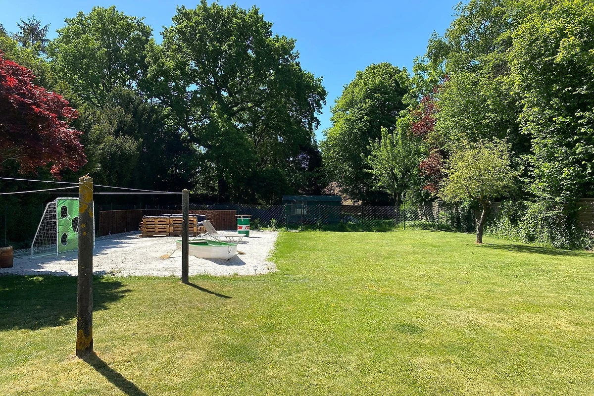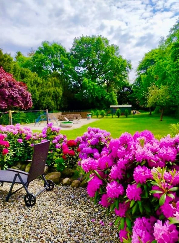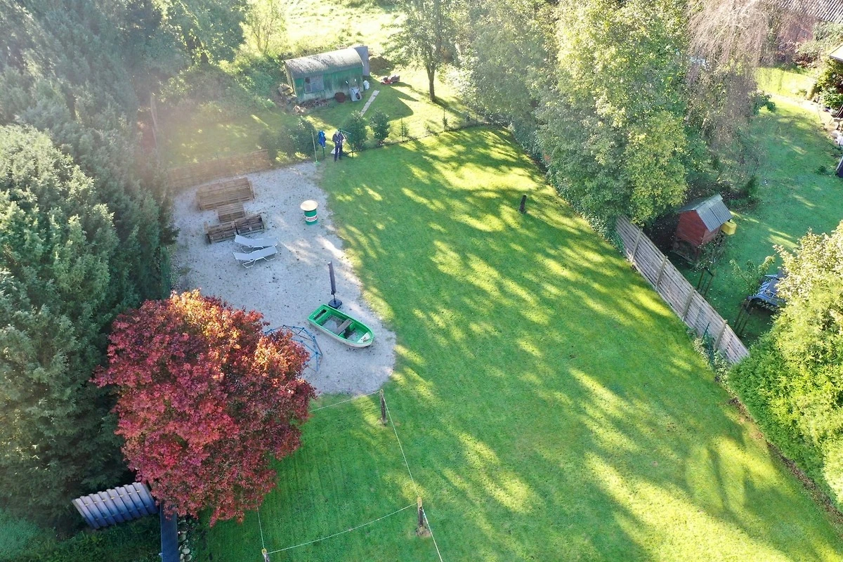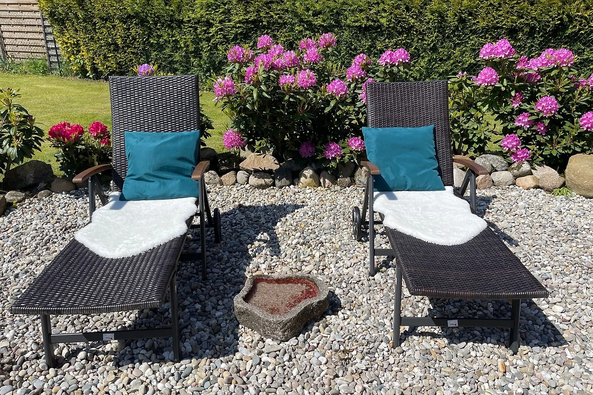 Im Garten befindet sich ein 90qm grosser Gartenstrand mit Palettenmöbeln, Liegen und einer Feuerstelle.