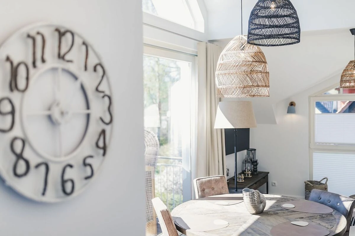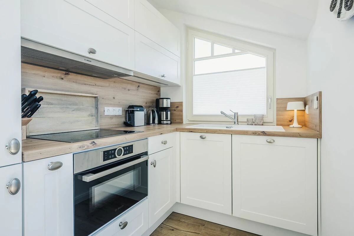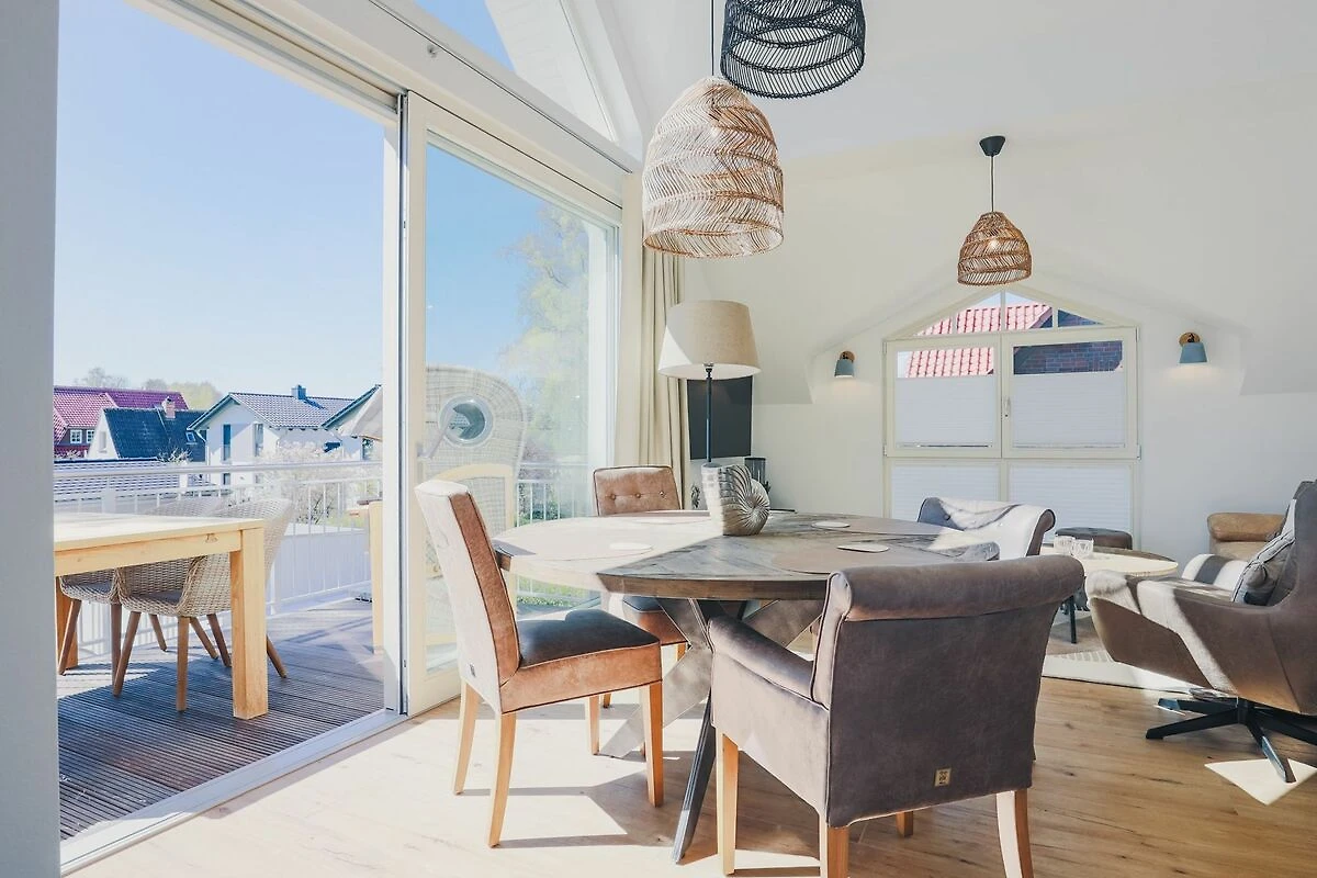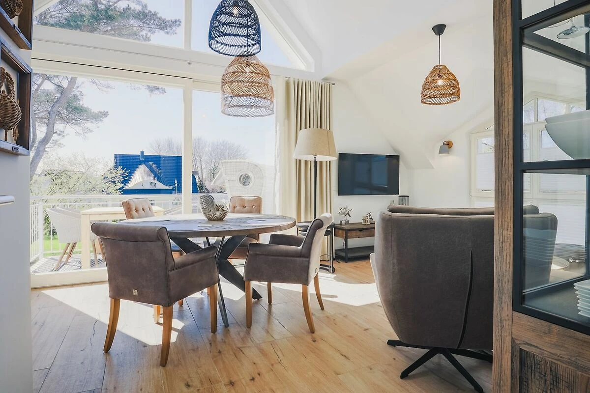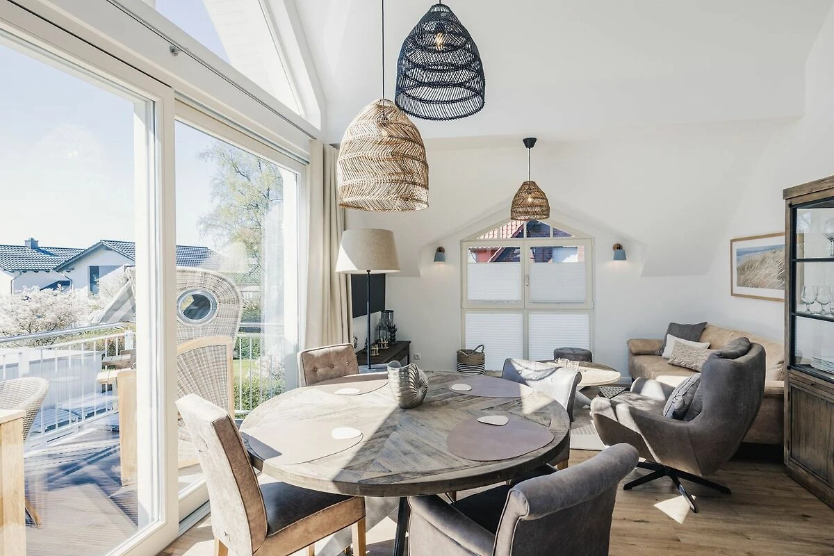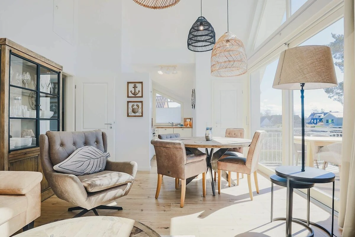 Die Wohnung ist sehr hell und hochwertig eingerichtet und besticht durch viel Liebe zum Detail und zum Meer. Das Herzstück der MeerLiebe ist der grosse und gemütliche Wohn-/ Essbereich mit offen gestalteter Küche mit einer Raumhöhe von bis zu 5 Metern.
