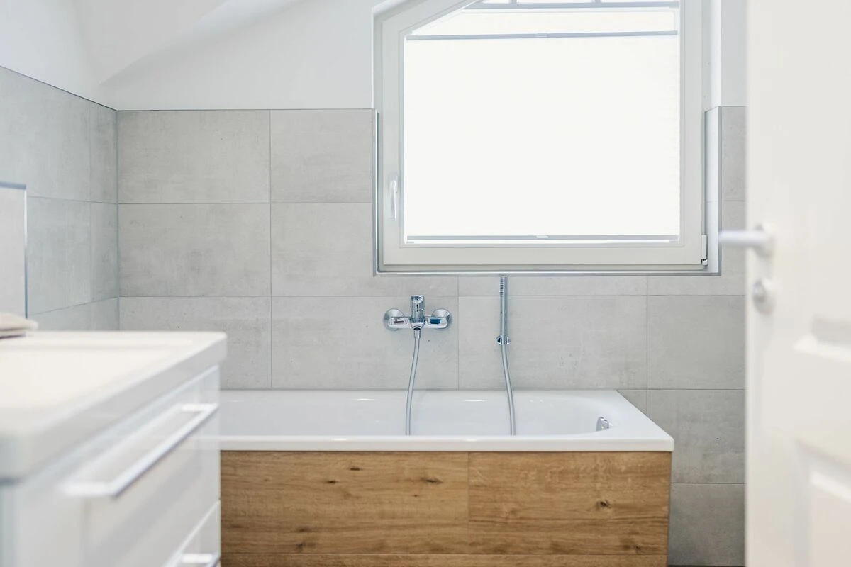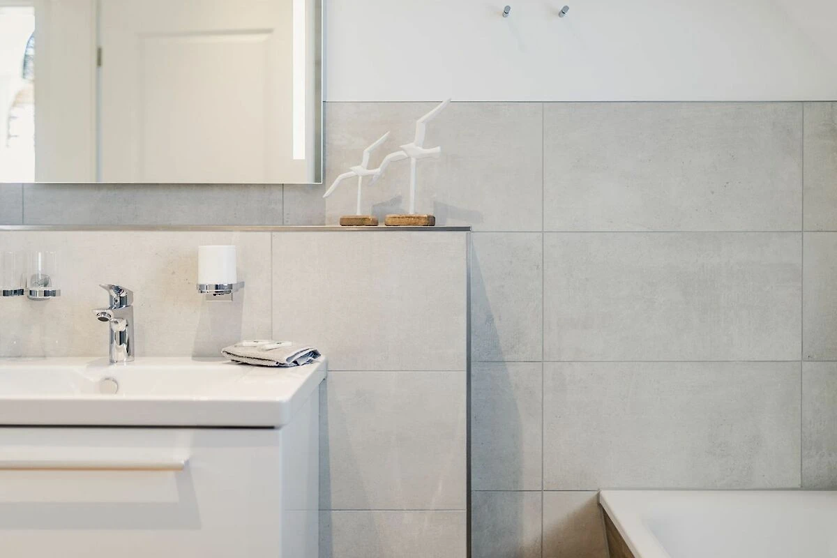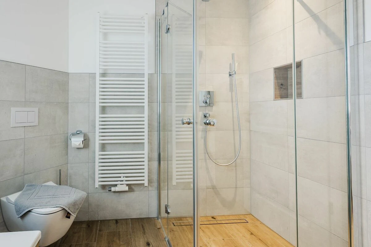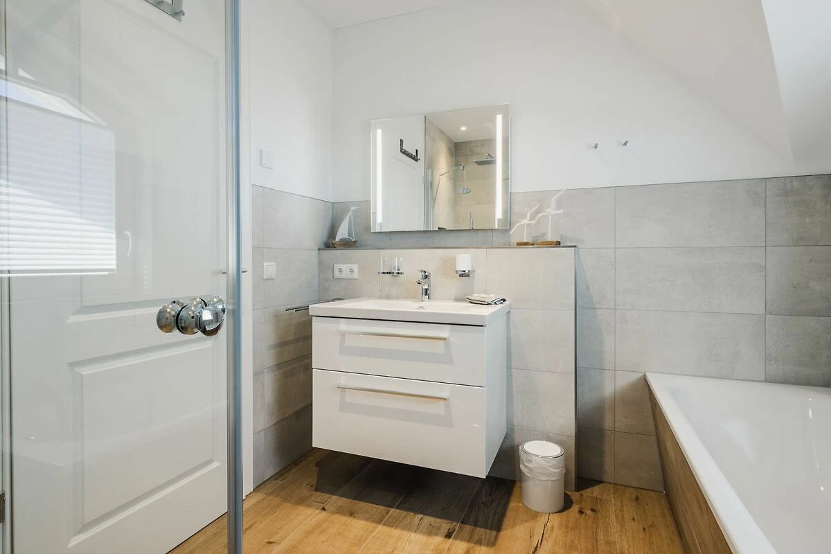 Das Badezimmer mit Tageslicht verfügt über eine Badewanne und eine hochwertige, bodentiefe Dusche mit Regenwald-Funktion, sodass Sie in Ihrem Urlaub entspannen können. Wie in der gesamten Wohnung geniessen Sie auch hier den Komfort der Fussbodenheizung.