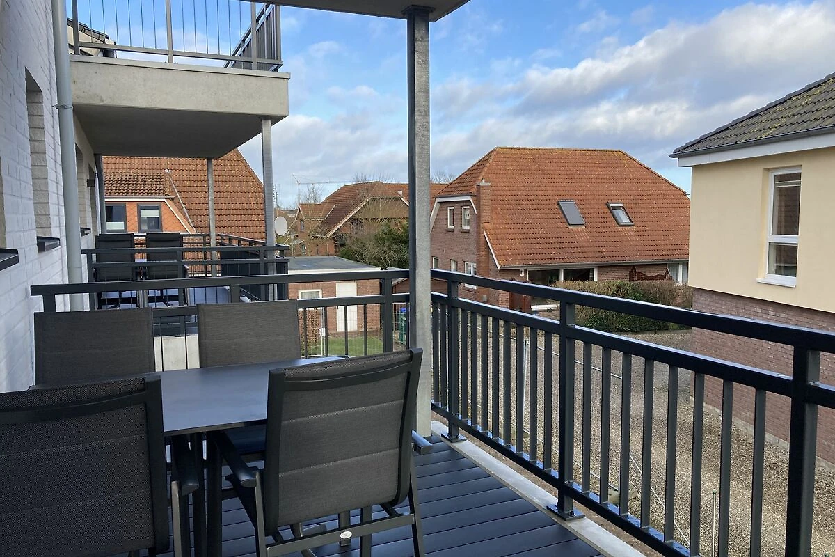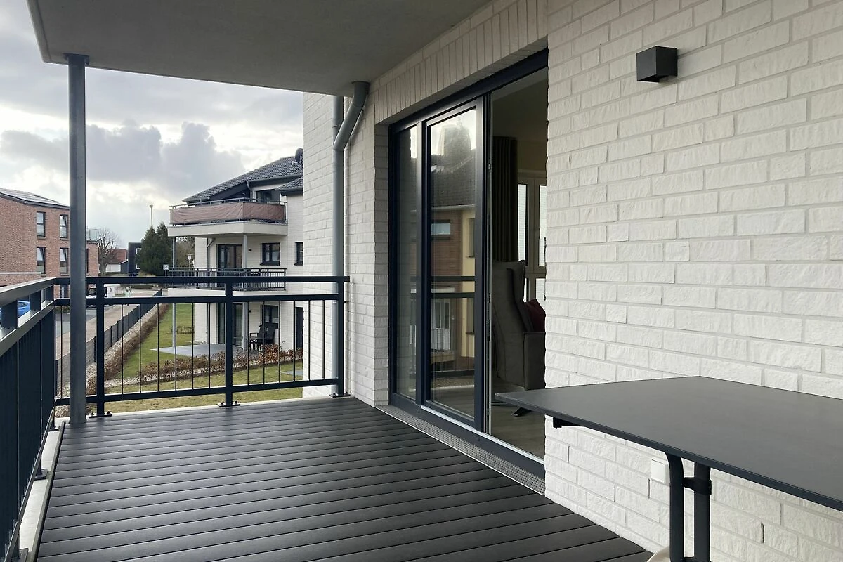 -Möblierter Balkon (Süd/Ost) mit Tisch, Stühlen und Sonnenschirm.