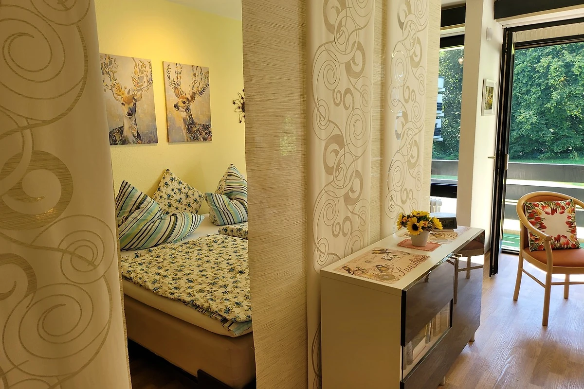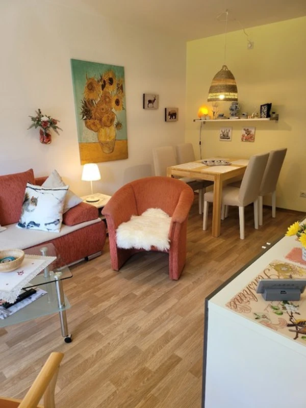Geradeaus erreicht man das Wohnzimmer mit gemütlicher moderner Essecke und einer Schlafcouch (z. B. für Kinder). Vom Wohnzimmer ist das Schlafzimmer durch Schiebegardinen abgeteilt. Der linke Durchgang führt zur linken Bettseite und zum Kleiderschrank. Durch den rechten Durchgang gelangt man zur rechten Bettseite und kleinen Schmink- oder Schreibtisch am Fenster.