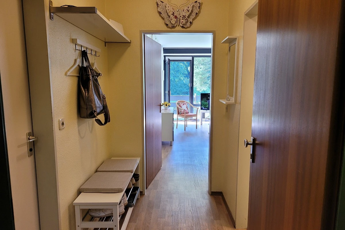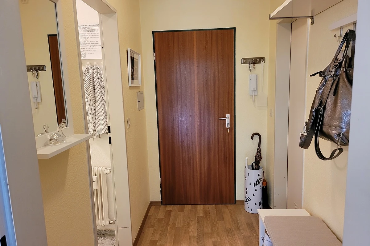 Die gemütliche und komfortable Ferienwohnung ist ca. 42m² gross. Von der Wohnungstür betritt man einen kleinen Flur, von dem links das Bad und rechts die Küche abgeht.