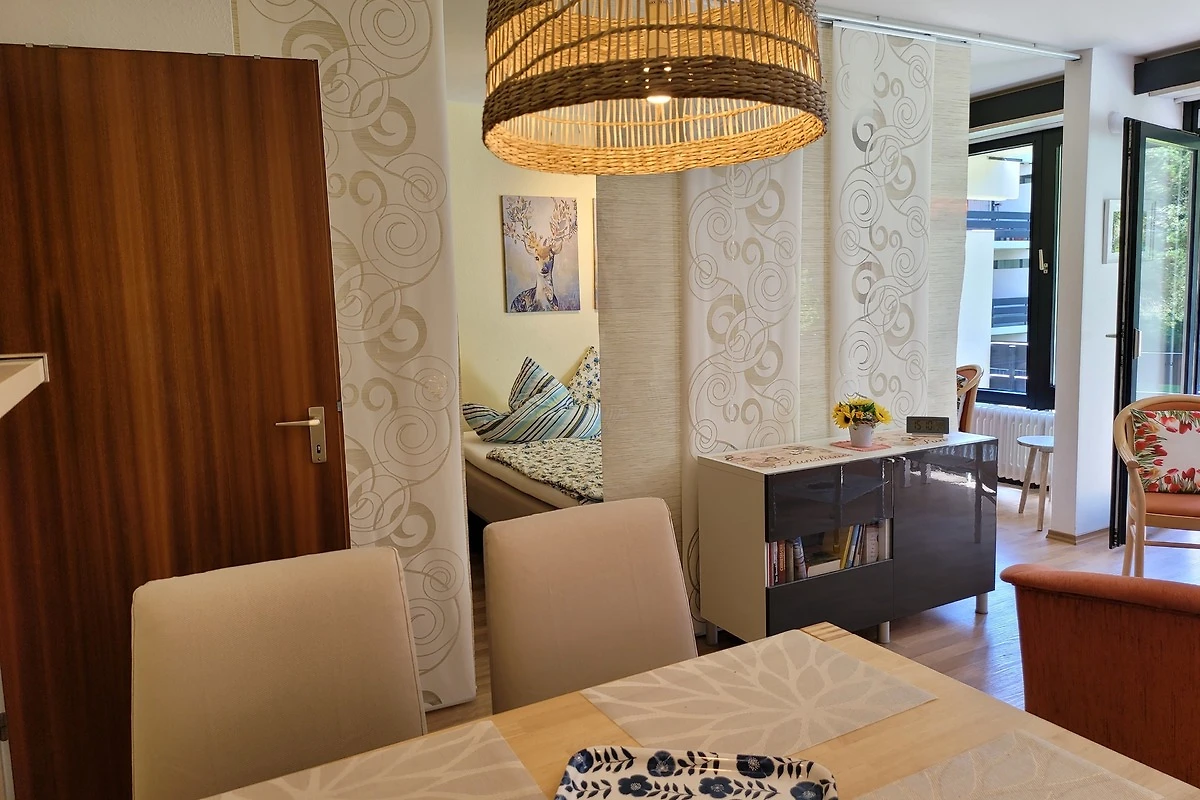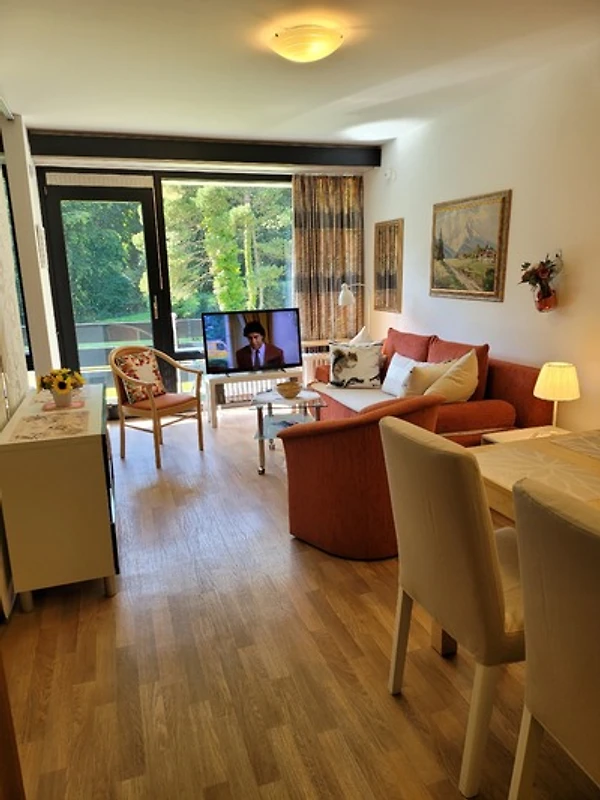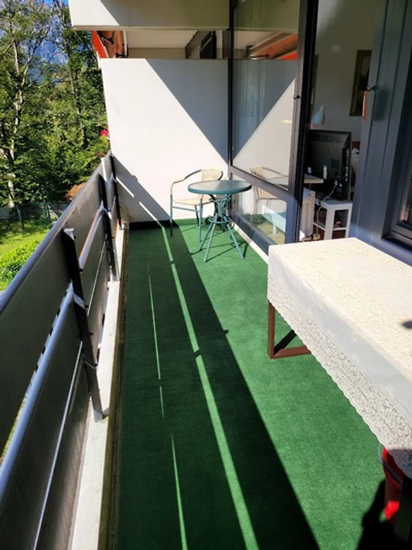 Im Wohnzimmer befindet sich ein moderner Fernseher mit einem Amazon TV-Stick und einem DVD-Player. Unter dem Fernseher steht der DVD-Player. Die gemütliche Coach kann zu einem Doppelbett (140×190) ausgezogen werden. Vom Wohnzimmer gelangt man auf den grossen Balkon. Dieser ist mit 2 bequemen Gartenstühlen und einem Tisch ausgestattet. In der Ecke steht ein Wäschständer für die nassen Badesachen.