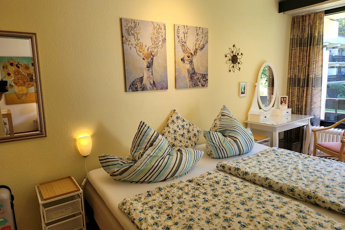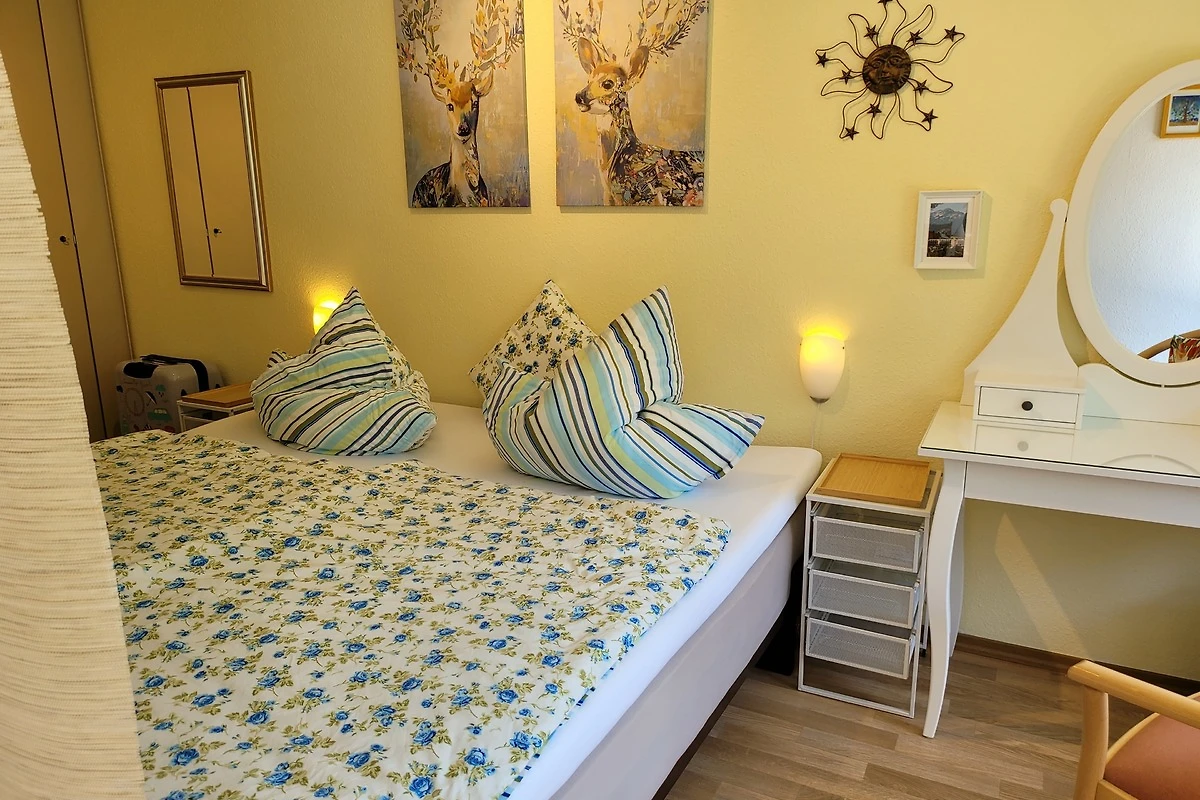 Das Schlafzimmer verfügt über ein Doppelbett mit einem Topper (200cmx200cm). Natürlich sind 2 Nachttische und Leselampen vorhanden. Am Fenster steht ein Schminktisch zum Schreiben oder Frisieren / Schminken (grosser Spiegel vorhanden). Ein Korbsessel lädt zum Lesen ein. Auf der anderen Bettseite steht der geräumige Kleiderschrank. In dem grossen Spiegel können Sie Ihr Outfit kontrollieren. Im Kleiderschrank ist auch Platz für die Koffer.