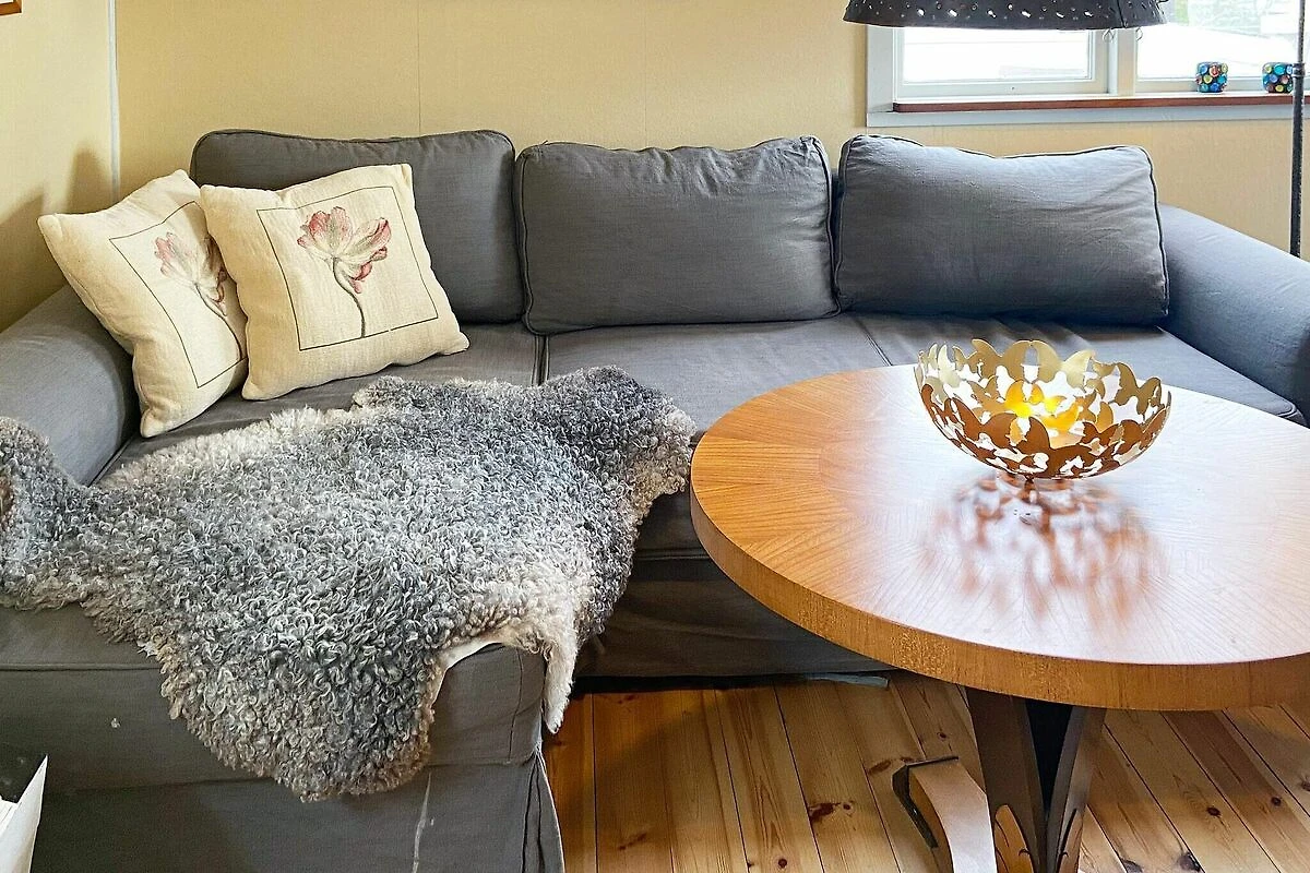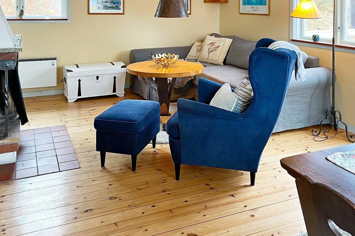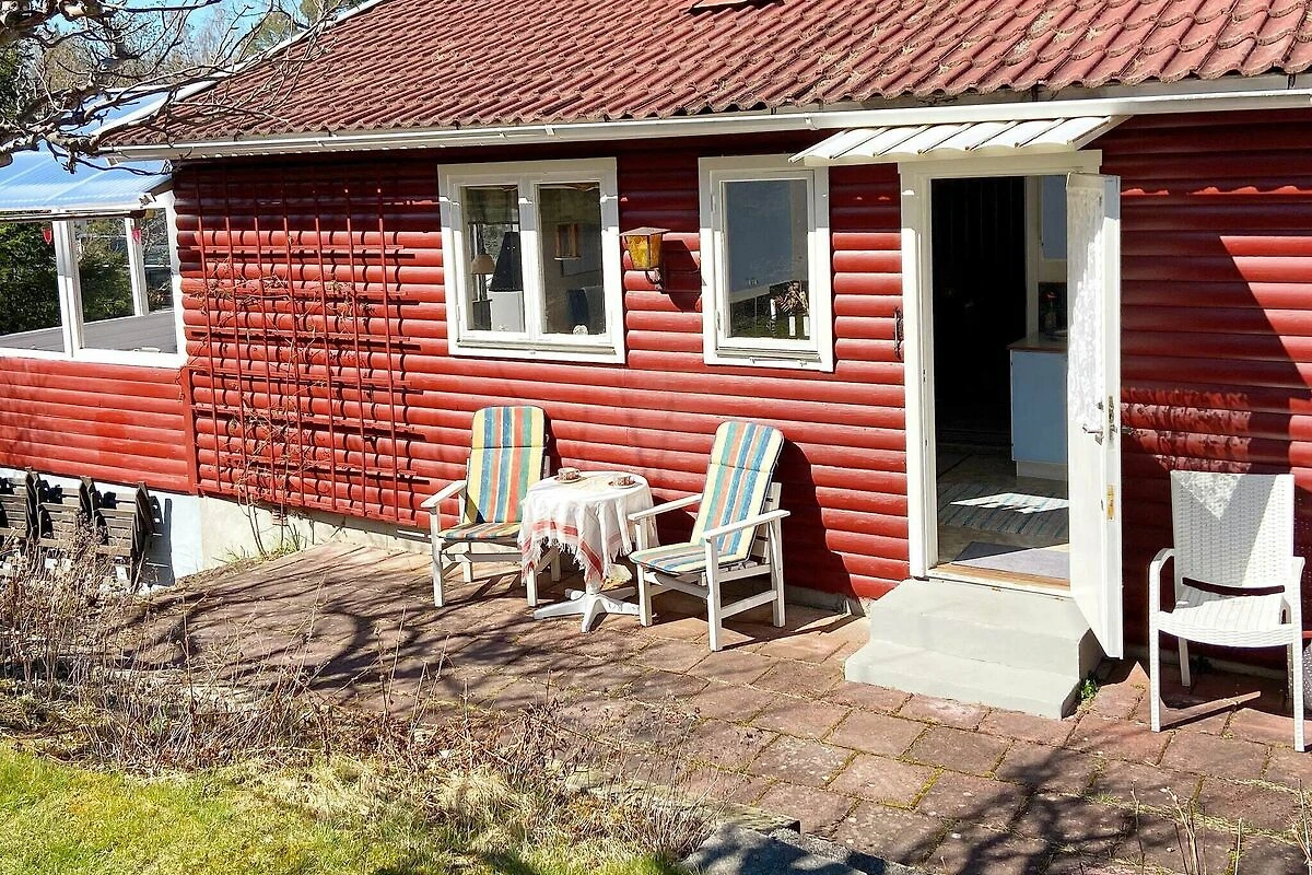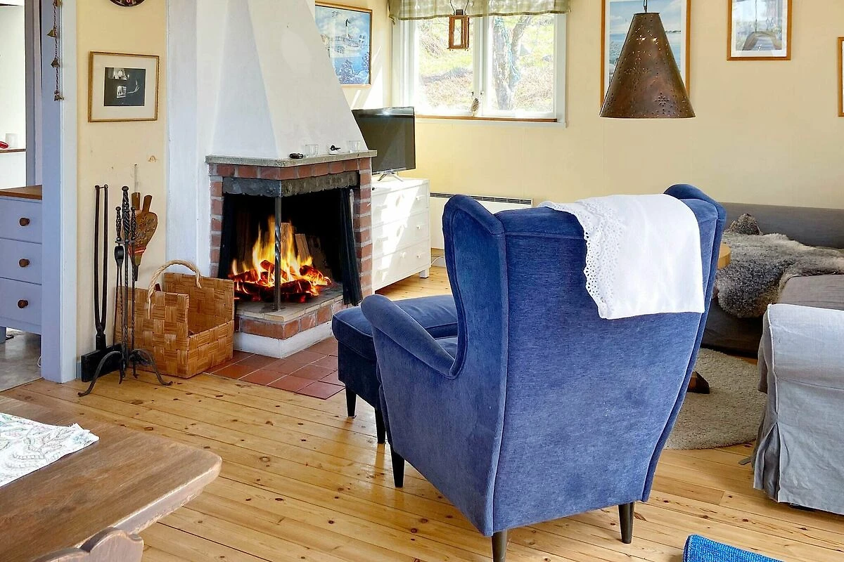 Küche(Holzherd, Kochherd(elektrisch), Dunstabzugshaube, Kaffeemaschine, Mikrowelle, Kühlschrank(+ Gefrierfach), Wasser vom Brunnen), Wohn-/Schlafzimmer(Doppelklappbett , TV(schwedische Fernsehsender), Kaminofen), Schlafzimmer(Doppelbett), Schlafzimmer(Einzelbett), Badezimmer(Waschbecken, Sitzbadewanne, Toilette), Heizung(elektrisch), Terrasse(überdacht), Gartenmöbel, Grill