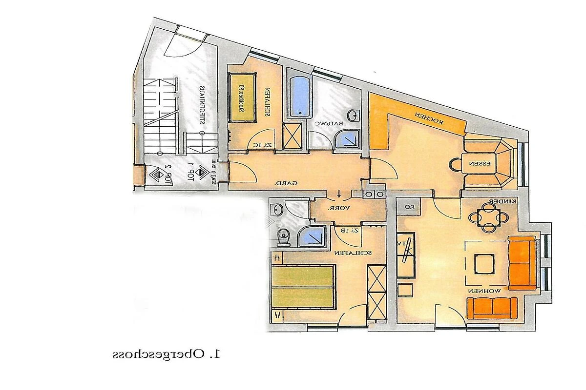 In der 1. Etage: (Wohnzimmer(Doppelschlafcouch, TV, Sitzecke), Küche(Esstisch, Kaminofen, Kochplatte(4 Kochplatten, Ceranfeld), Wasserkocher, Kaffeemaschine, Backofen, Spülmaschine, Kühlschrank(+ Gefrierfach)), Schlafzimmer(Etagenbett), Schlafzimmer(Doppelbett, Balkon), Badezimmer(Dusche, Toilette), Badezimmer(Dusche, Toilette))