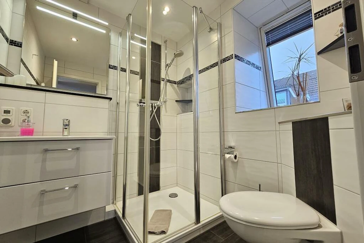 Das renovierte Badezimmer verfügt über eine moderne Dusche, WC und einen Föhn.