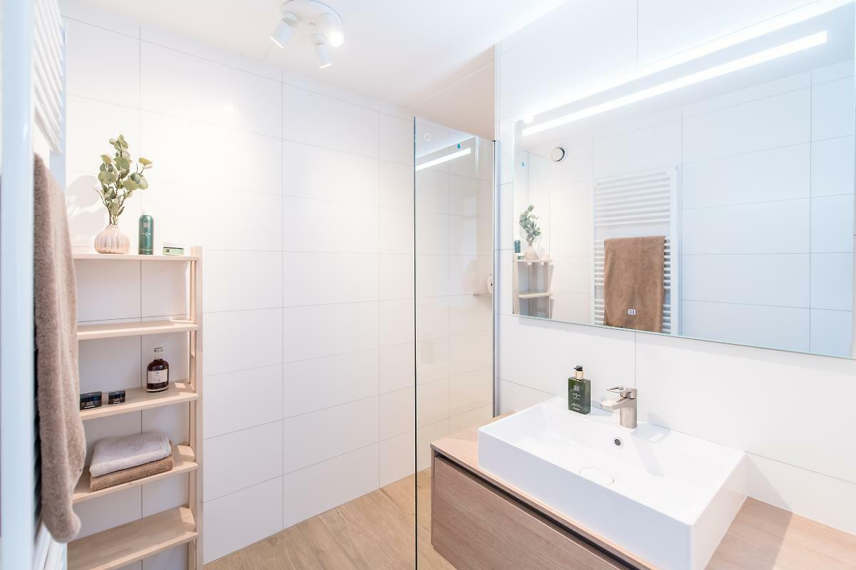 Das Appartement verfügt über zwei Schlafzimmer. Im ersten davon finden Sie ein grosszügiges Doppelbett und eine grosse Glastür zum Balkon. Im zweiten Schlafzimmer steht neben dem Etagenbett auch noch ein Einzelbett. Das grosse Badezimmer hat eine Duschkabine und ein Waschbecken. Zudem gibt es ein separates WC.