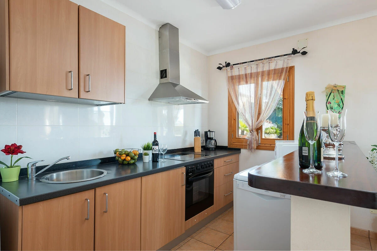 Dies ist ein einstöckiges Haus. Der Hauptraum verbinded das Wohnzimmer, Küche und Esszimmer mit Klimaanlage, Sat-TV und einem Cerankochfeld. Es gibt auch eine Waschmaschine, Bügeleisen und Bügelbrett. Es gibt zwei Schlafzimmer, eines mit Doppelbett und Klimaanlage und das andere mit zwei Einzelbetten. Das Badezimmer des Hauses verfügt über eine Dusche. Wir können auf Anfrage ein Kinderbett und einen Hochstuhl vorbereiten, falls Sie mit Ihrem Baby reisen.