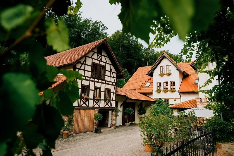 Wunderschön gelegen direkt an der Südlichen Weinstrasse liegt das Kleinod Klingenmünster. In Traumlage direkt unterhalb der Burg Landeck liegt unser biologisch geführtes Weingut. Drei Generationen bewirtschaften die Rebfläche zu 100 % BIO . Im alten Fachwerkhaus, zentral im Gutshof gelegen, finden Sie unsere stillvoll renovierte Ferienwohnung. Natürliche Materialien, wie Kalk- und Lehmputze, Kalkfarben und Eichendielen, bereiten ein wunderbares Raumklima. Hinter dem Haus gurgelt ein kleines Bächlein, die frische Waldluft wird vom Vogelgezwitscher erfüllt. Eine alte Stiege führt direkt vom Gutshof bis zur besten Weinlage , dem Kirchberg. Direkt am Haus liegen wunderbare Rad- und Wanderwege. Auch der Aufstieg zur Burg beginnt vor der Tür.