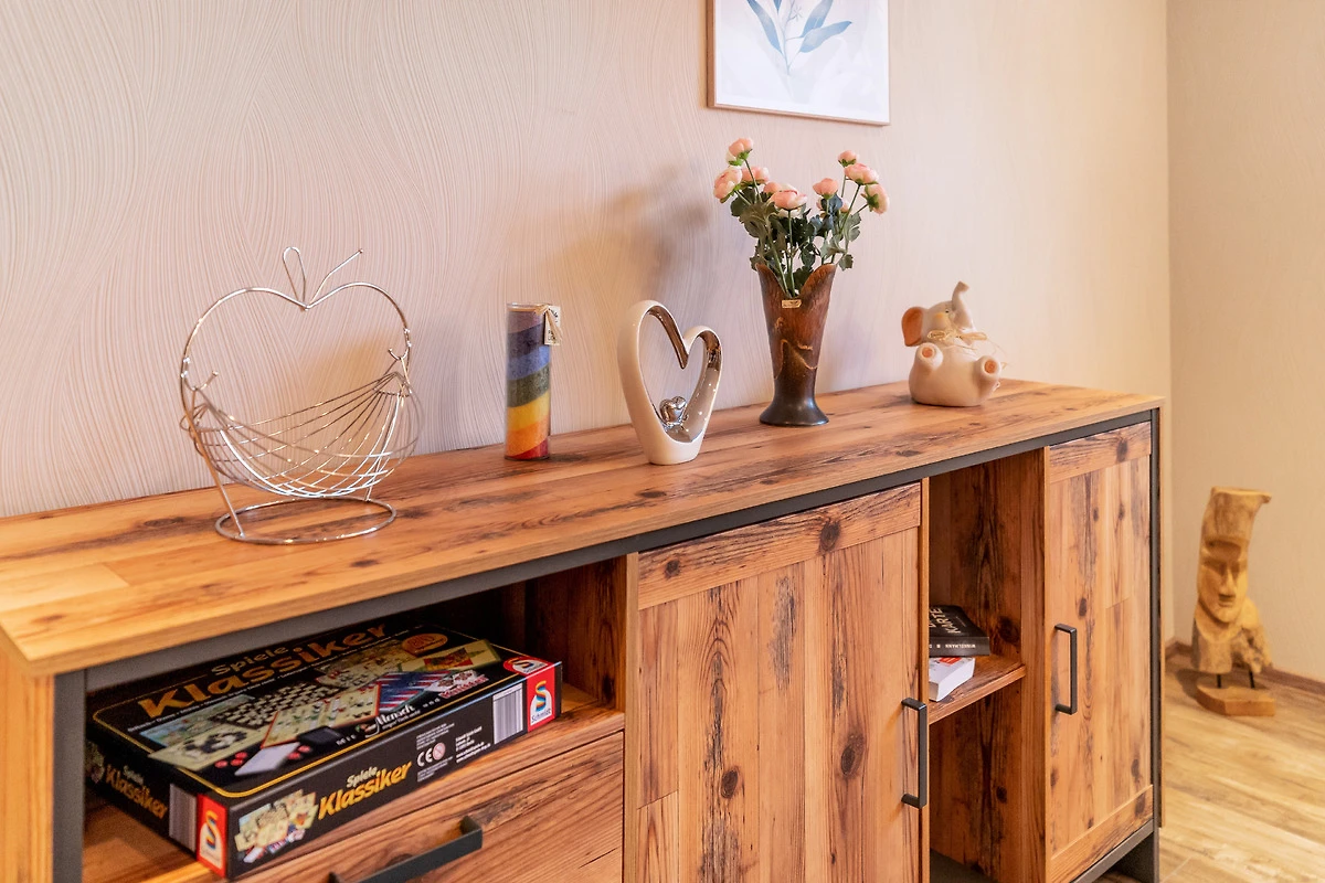 Die Wohnung erstreckt sich über zwei Etagen. Im Untergeschoss befindet sich eine separate Küche mit Einbauküche und einem Tisch; ein offenes Wohn- und Esszimmer mit gemütlichem Sofa, TV und einem grossen Esstisch und ein Badezimmer mit grosser ebenerdiger Dusche und Badewanne. Die beiden Schlafzimmer mit jeweils einem Doppelbett (1,80x2,00 m) befinden sich im Obergeschoss.