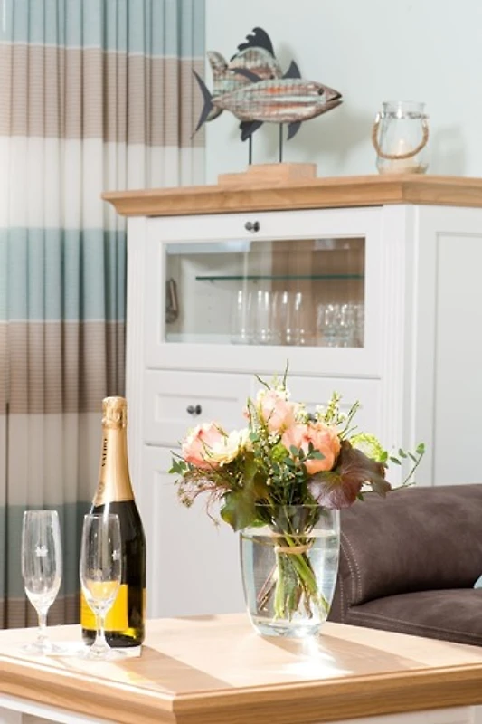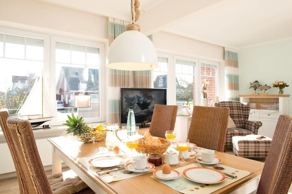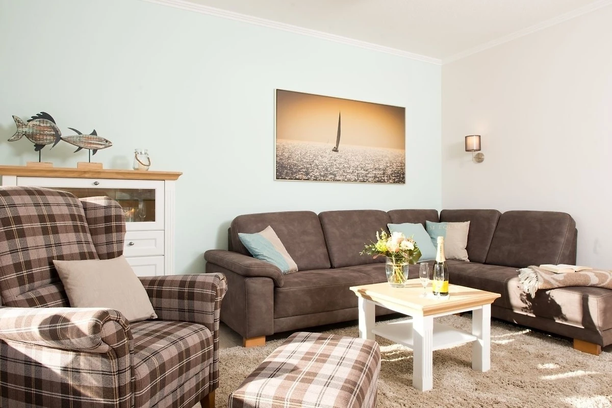 Die in allen Wohneinheiten identische Ausstattung im Einzelnen: Heller Eingangsflur, geräumiges Wohnzimmer mit gemütlicher Eckcouch und grossem Esstisch, Flachbild-TV, Stereoanlage, Telefon, separate moderne Küche, u. a. mit Mikrowelle, Geschirrspüler und Backofen, 3 Schlafzimmer (5 exklusive Boxspringbetten für erholsamen Schlaf), Safe, Badezimmer mit Doppelwaschtisch und Dusche, separates Gäste-WC im EG, Südbalkone auf beiden Wohnebenen. Münzwaschmaschine und -trockner, ein Fahrradkeller und der hauseigene Grill- und Spielplatz runden das Angebot ab.