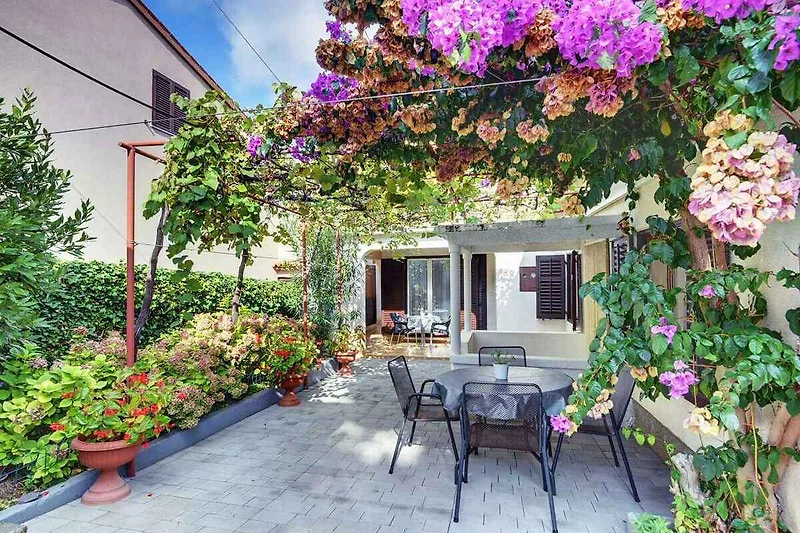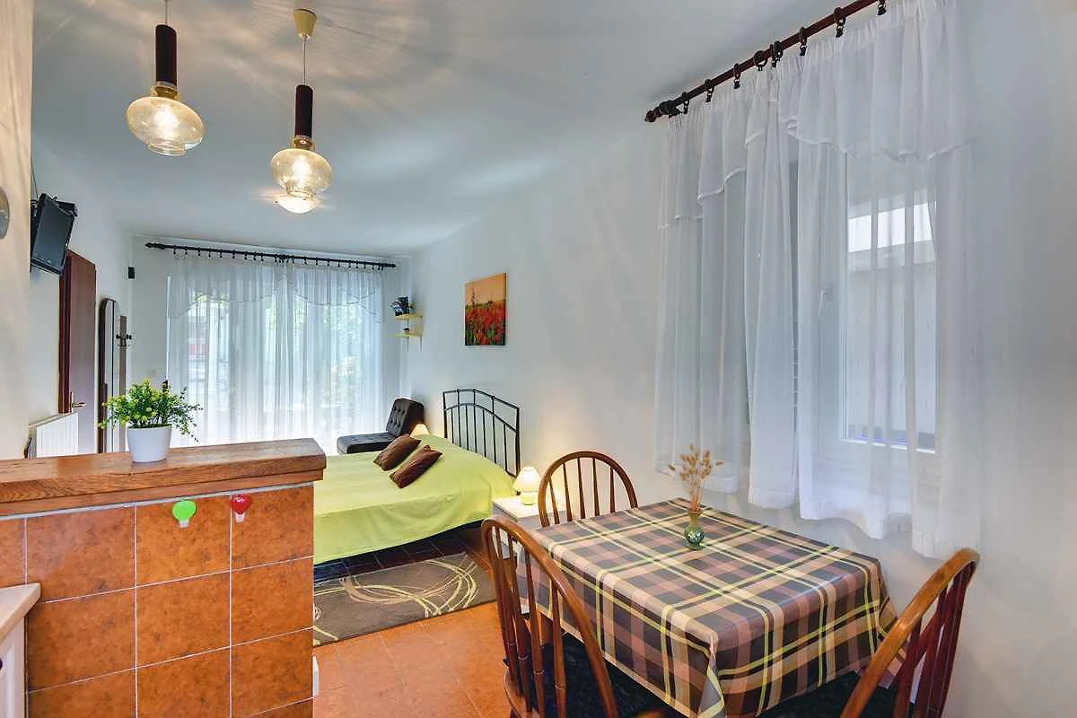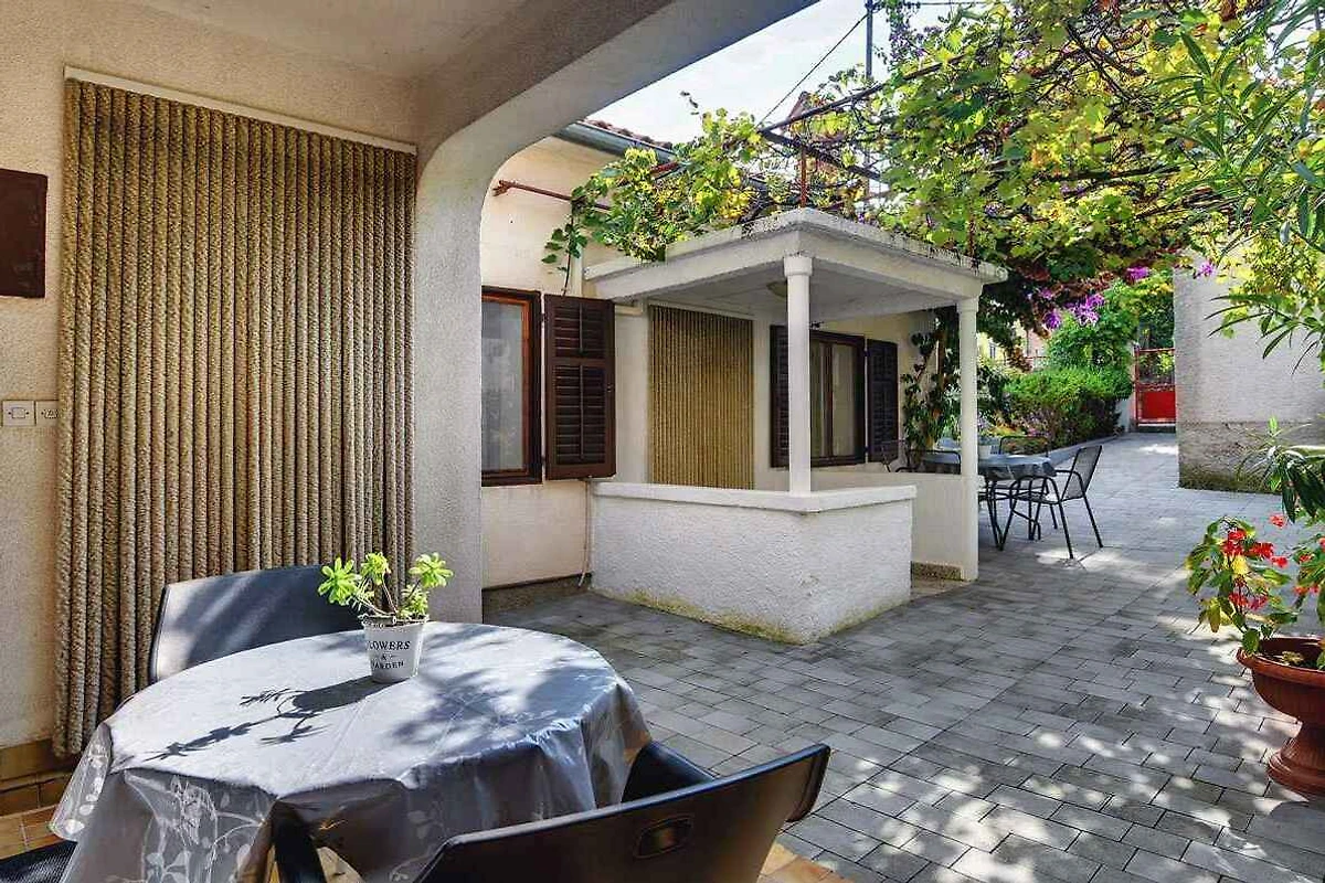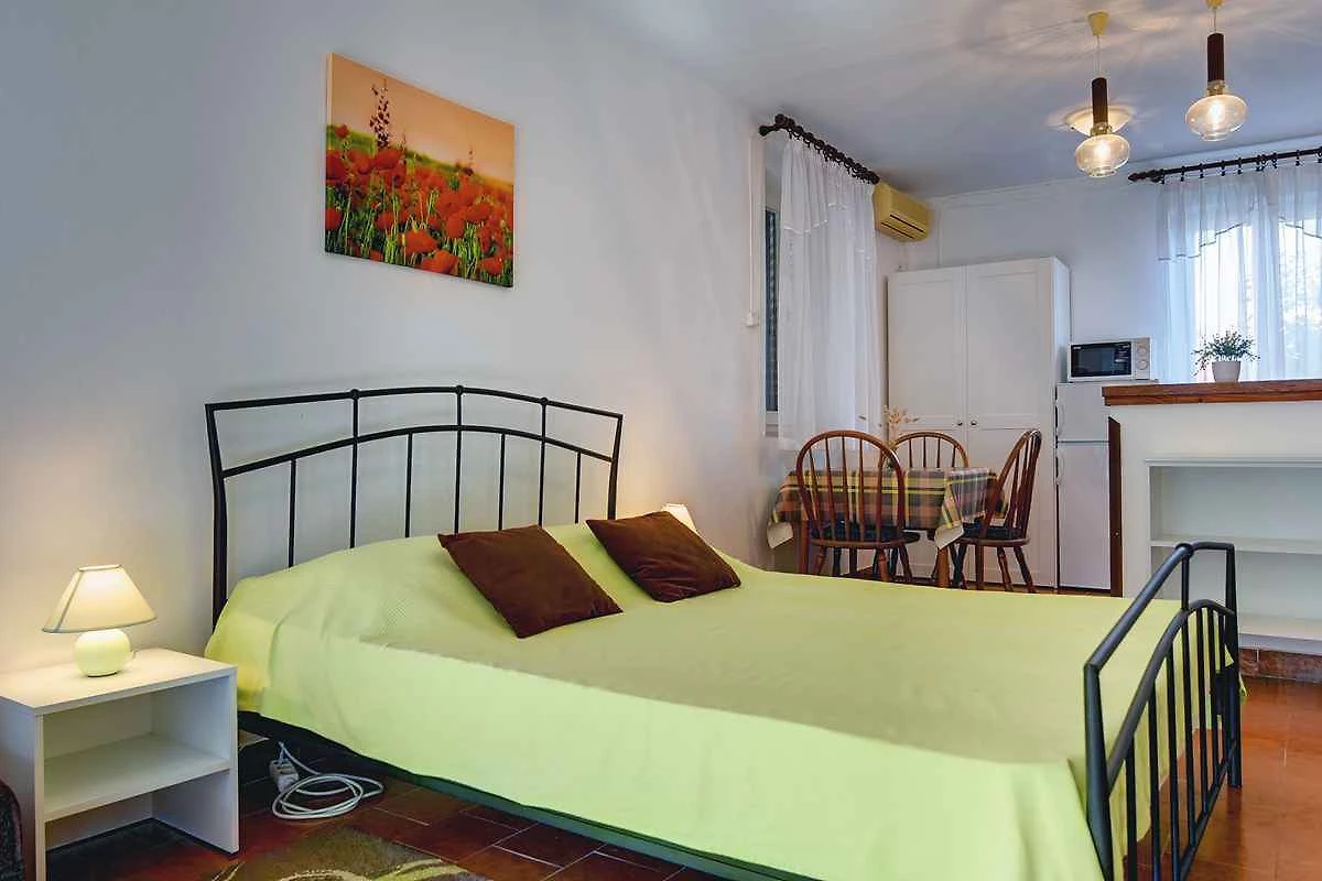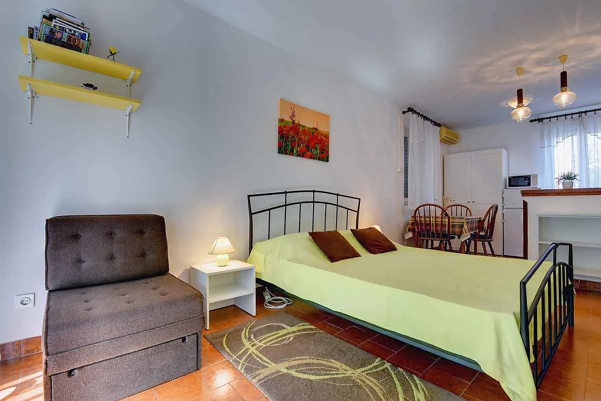 Pomer. Das Studio befindet sich auf einem geschlossenen Gartengrundstück mit Blumen, Sträuchern und Bäumen, von einem Zaun begrenzt. Der Vermieter wohnt ständig im Haus, nutzt jedoch einen separaten Eingang. Die Zufahrt erfolgt über eine Nebenstrasse (asphaltiert). Parkplatz (für 1 Pkw) auf einem Parkplatz im Ort.