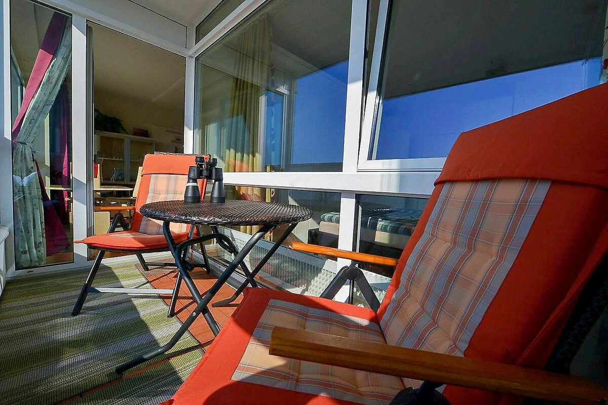 Für die Zeit nach langen Strandtagen bietet sich der überdachte und verglaste Westbalkon, der sich komplett öffnen lässt, dazu an, den Abend an der Meeresluft ausklingen und die Blicke, vom 14. Stock aus, über das Meer schweifen zu lassen.